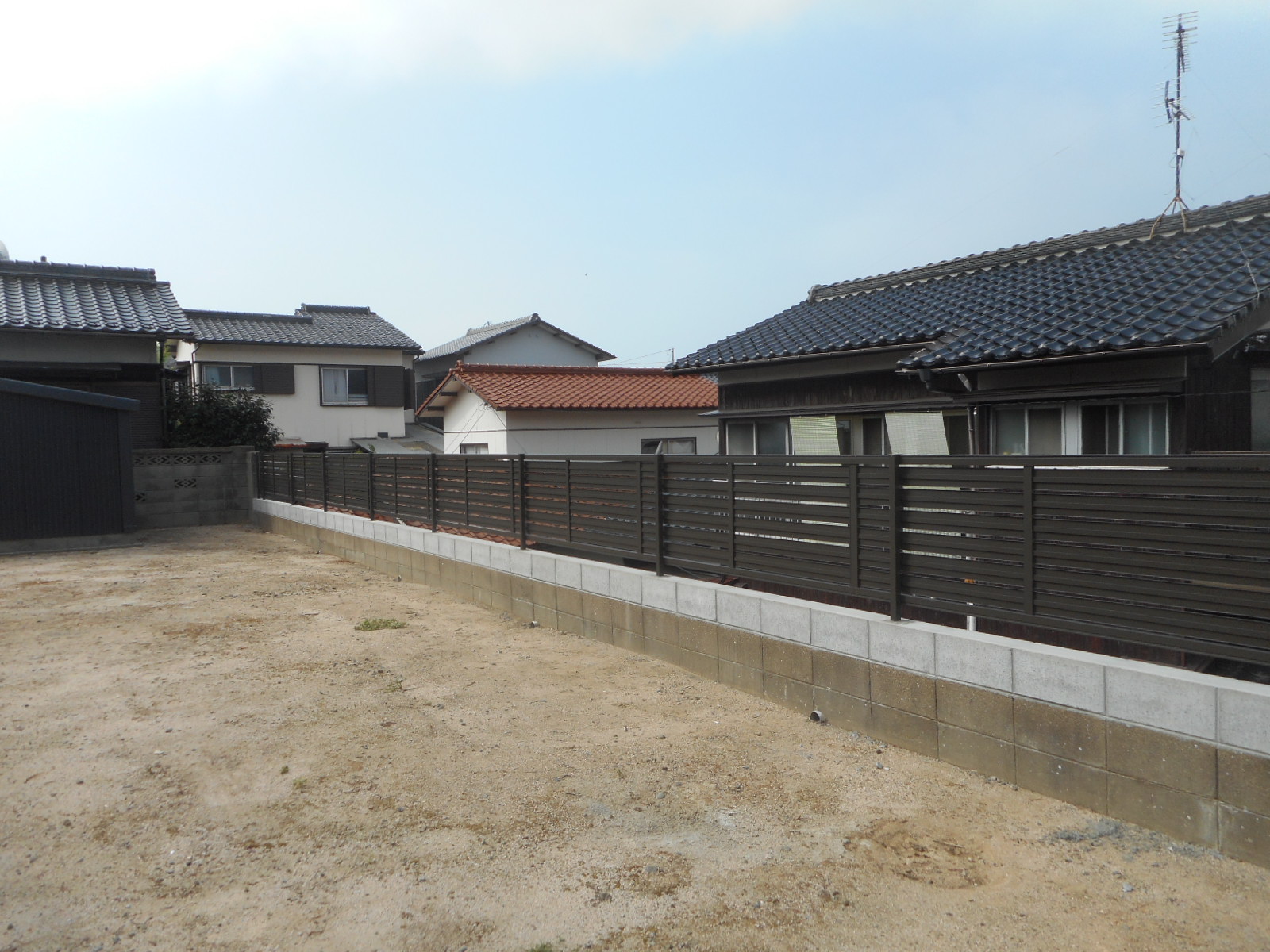 ・全長約50mある既存のフェンスと束石を撤去し、新規に1段15cmグロックを施工し、その上に新規に高さ80cmのフェンスを取付ける工事を行います。