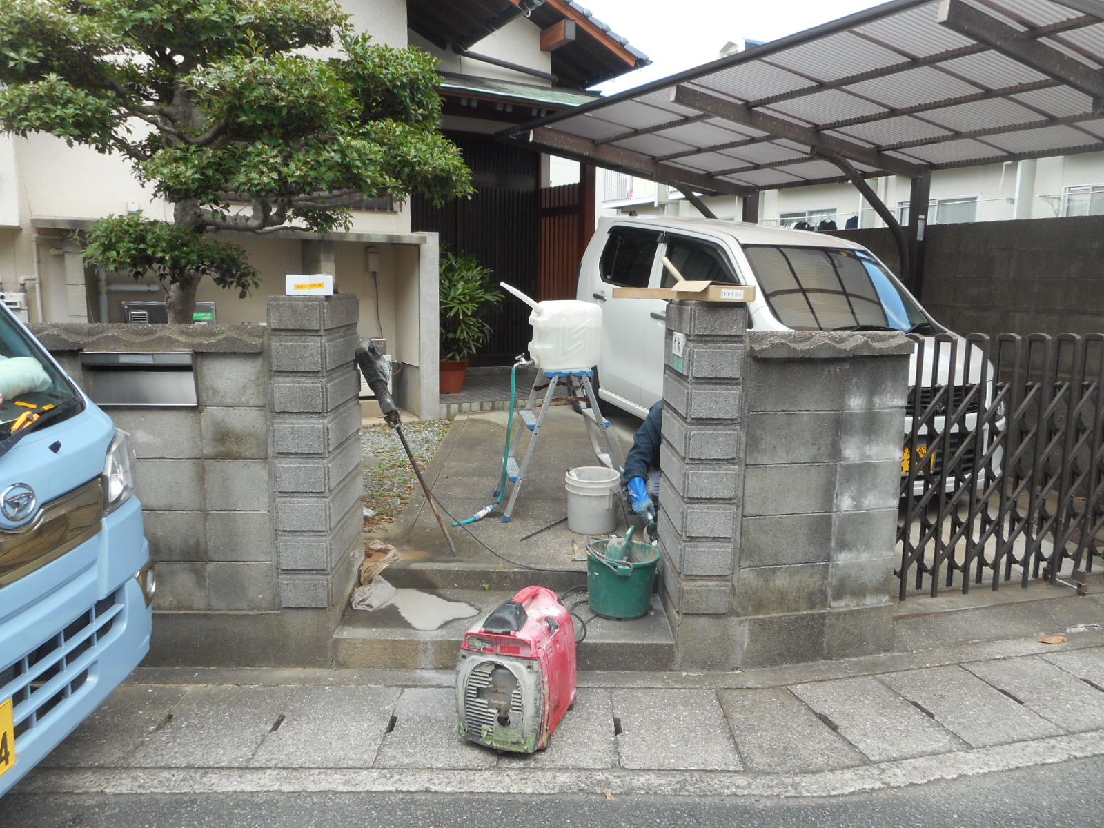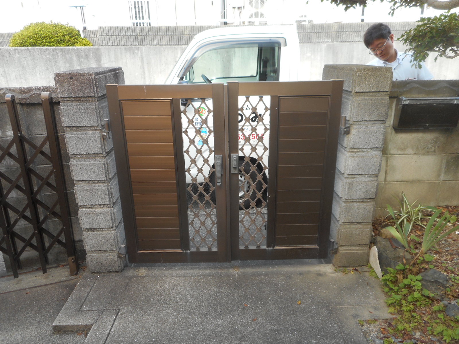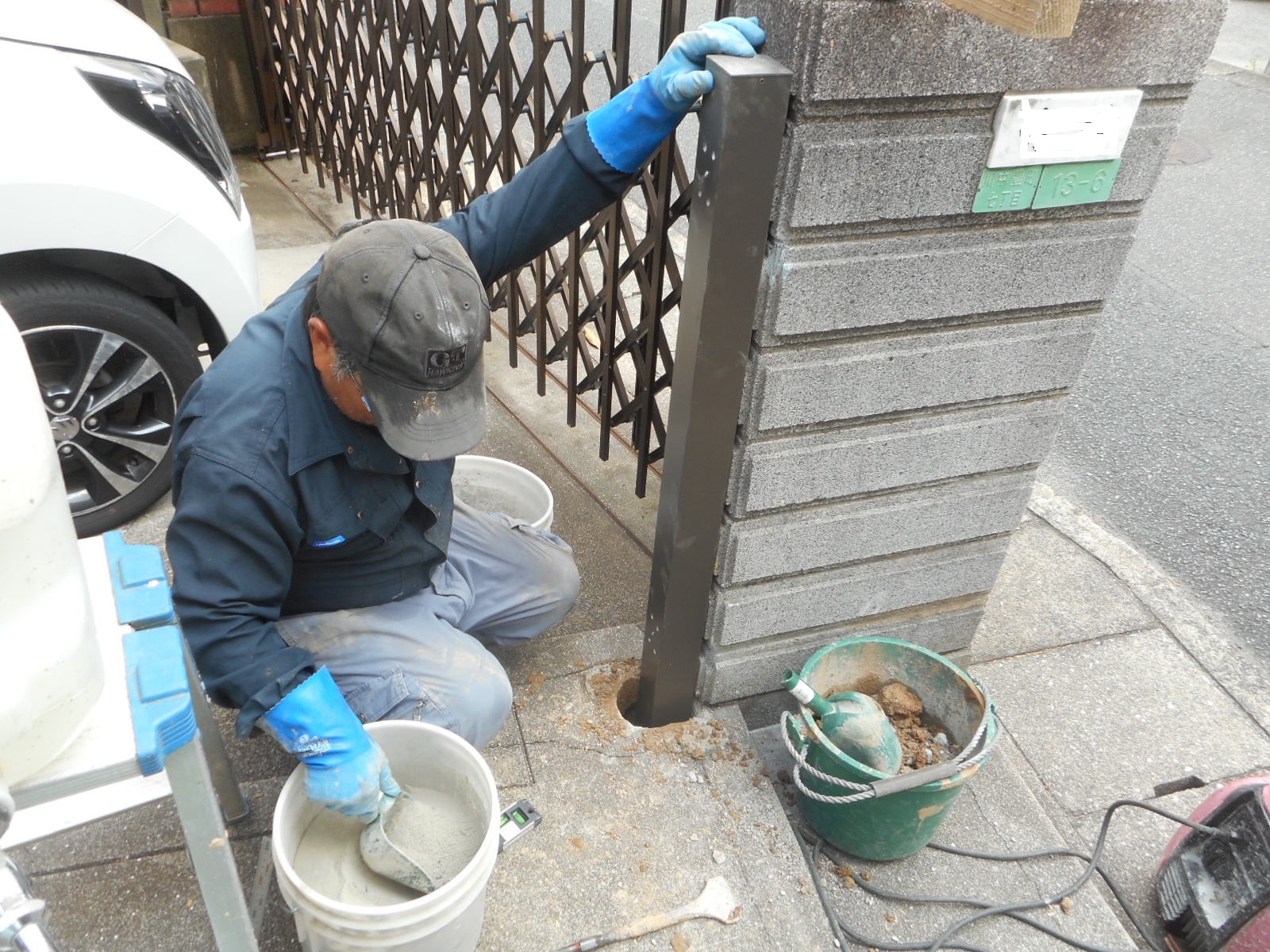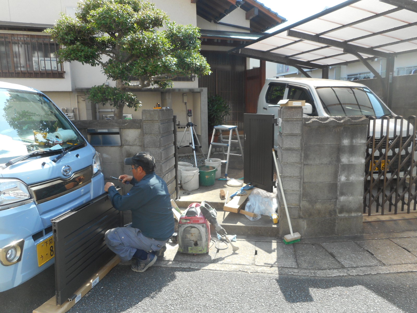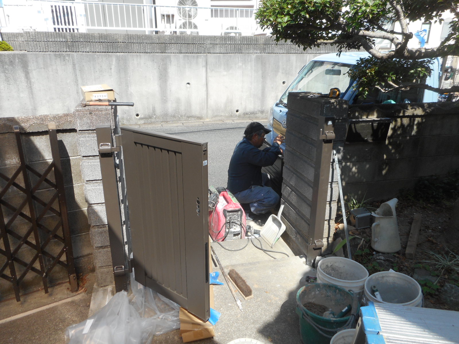 | 新規門扉を、セットします!! | セットした門扉を、組付けます!! |