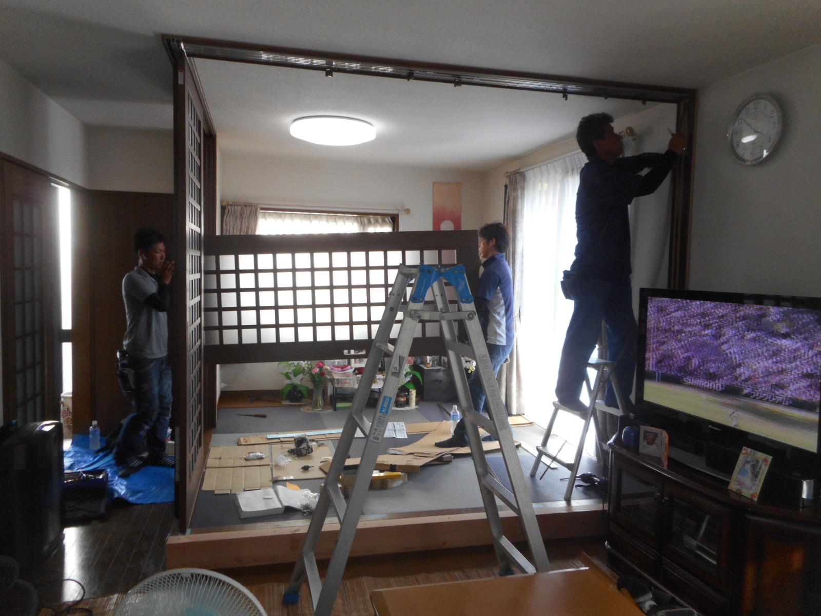 LGSコーナータイプ2枚プラス3枚の上吊元の引き戸取付け、間仕切りすることにしました。