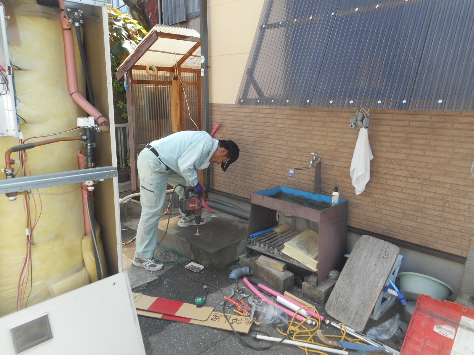 | 既設の電気温水器を、撤去しました!! | エコキュートの転倒防止アンカーの、下穴を明けます!! |