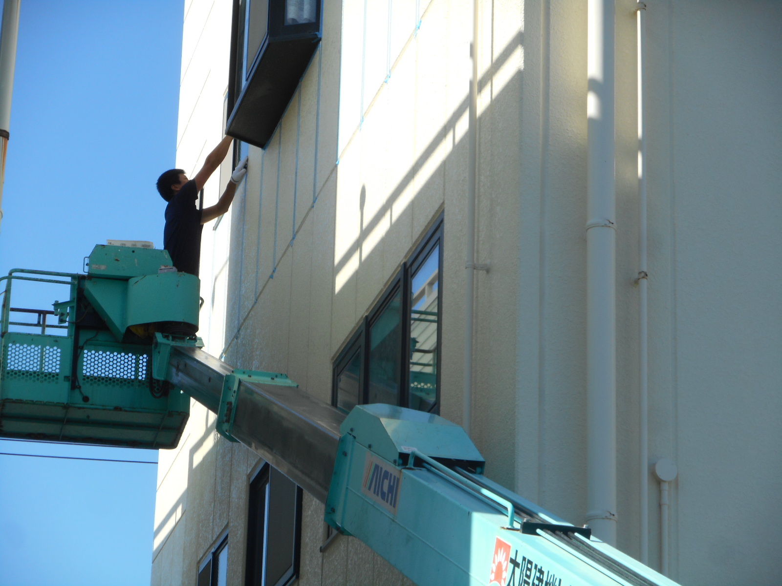 | 高所作業車で、作業をします!! | 外壁の目地廻りや、出窓廻りに養生テープを貼っています!! |