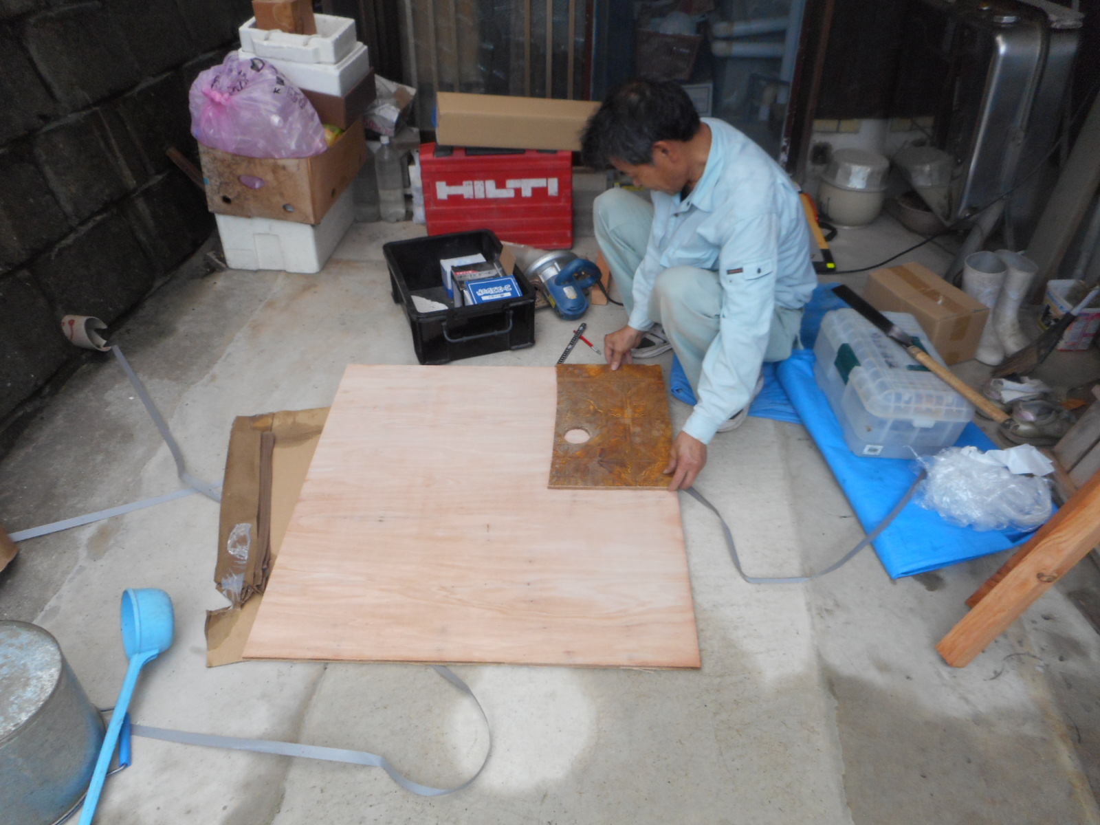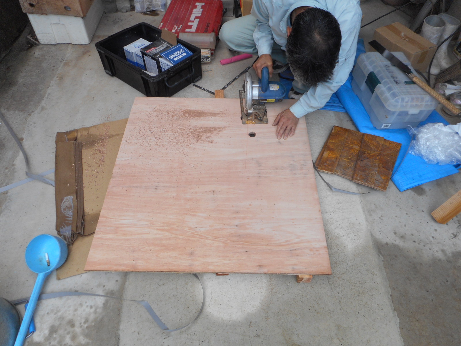 解体した廃材を型紙にし、型取りをします!! コンパネを、加工します!!