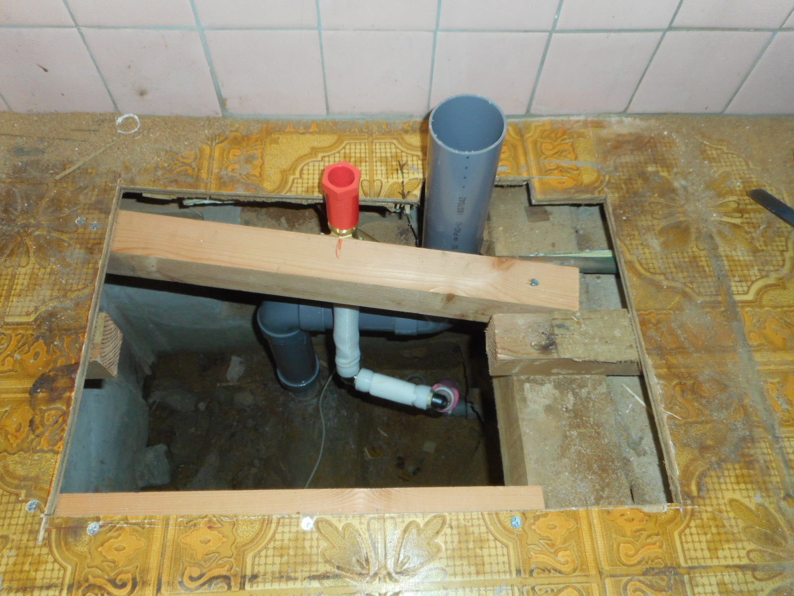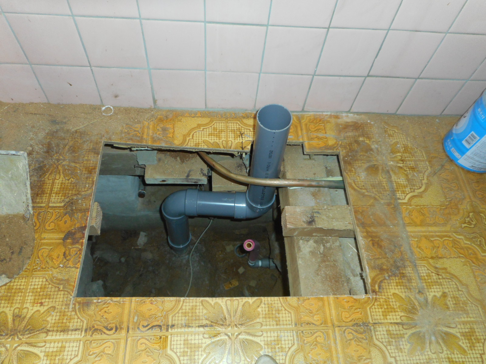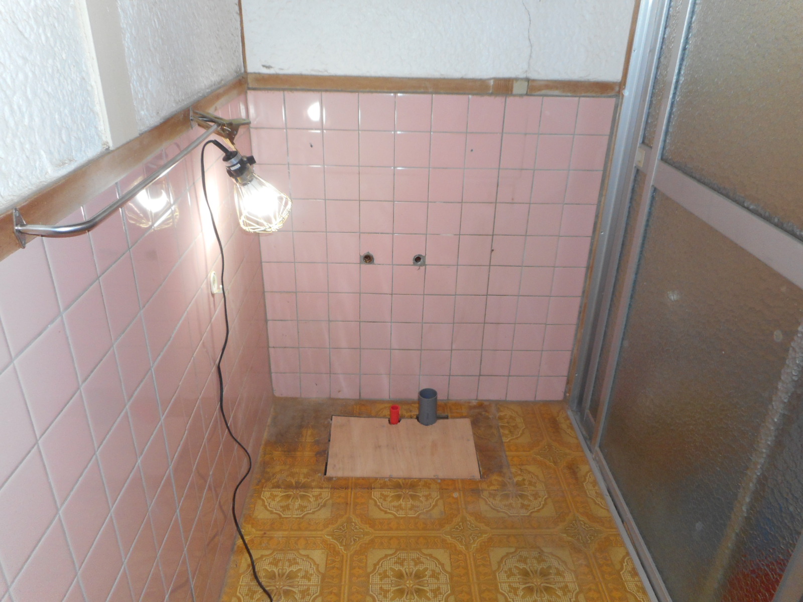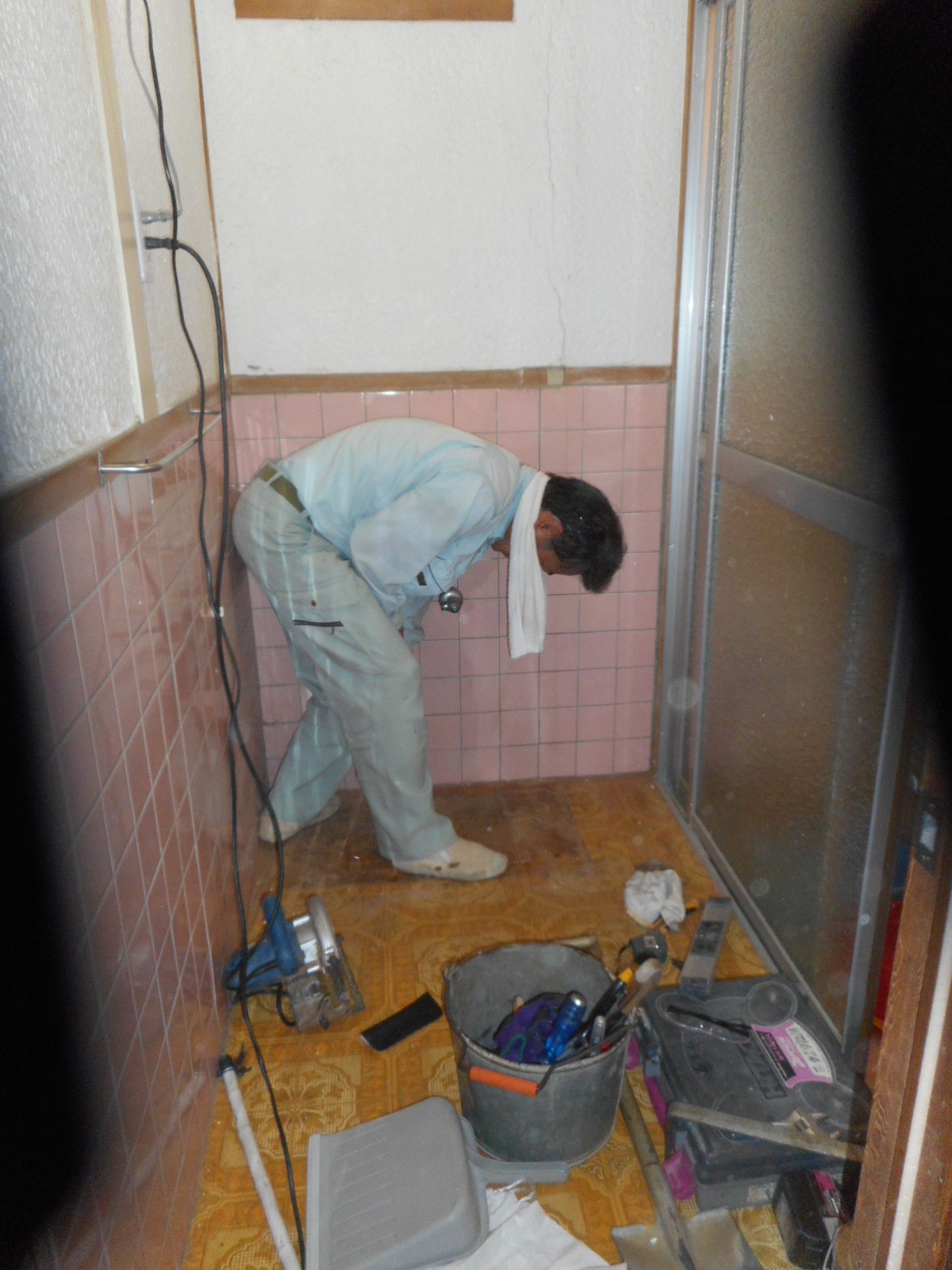 既存の化粧台を撤去し、床の一部を開口します!! 床を開口し、床下に溜まった水を汲み取ります!!