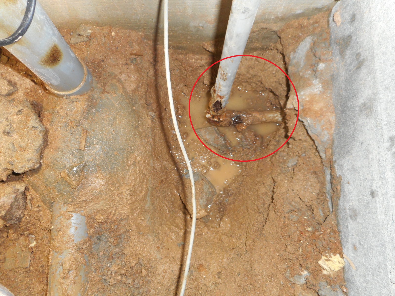 で囲った部分の給水管(鋼管)のエルボ部分から若干の漏水が確認できました!! 部分をエンビのエルボ管に交換しそこから給水管も新規にします!!