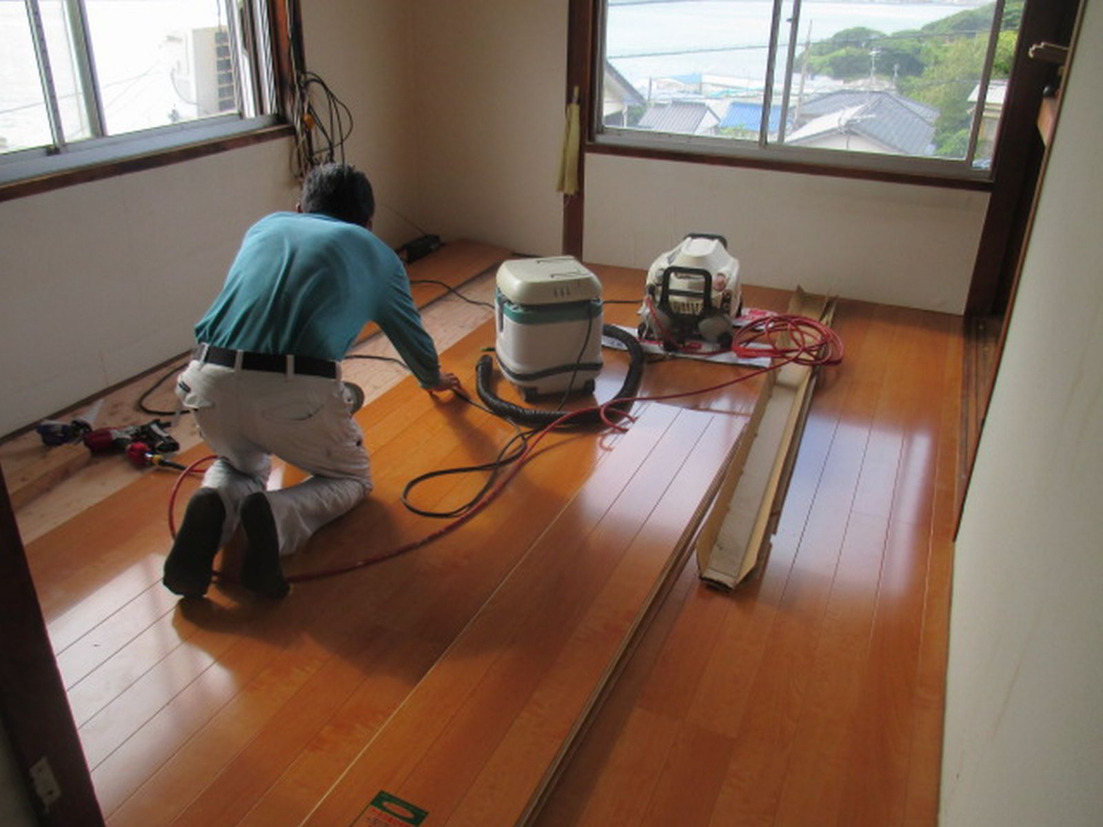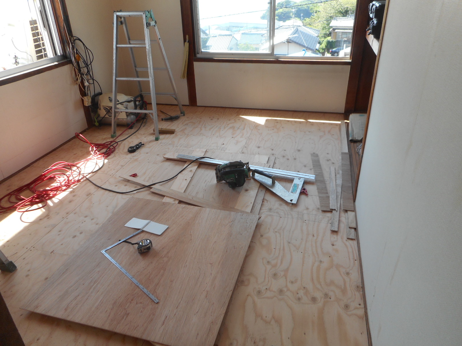 既存の畳を撤去し、捨て張り合板を施工します!! 新規のフロア材を、施工します!!
