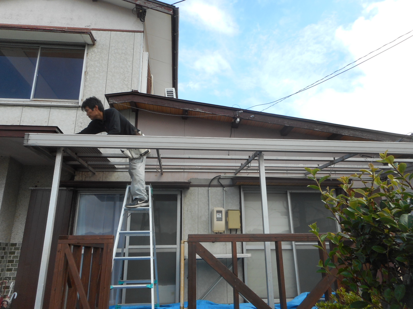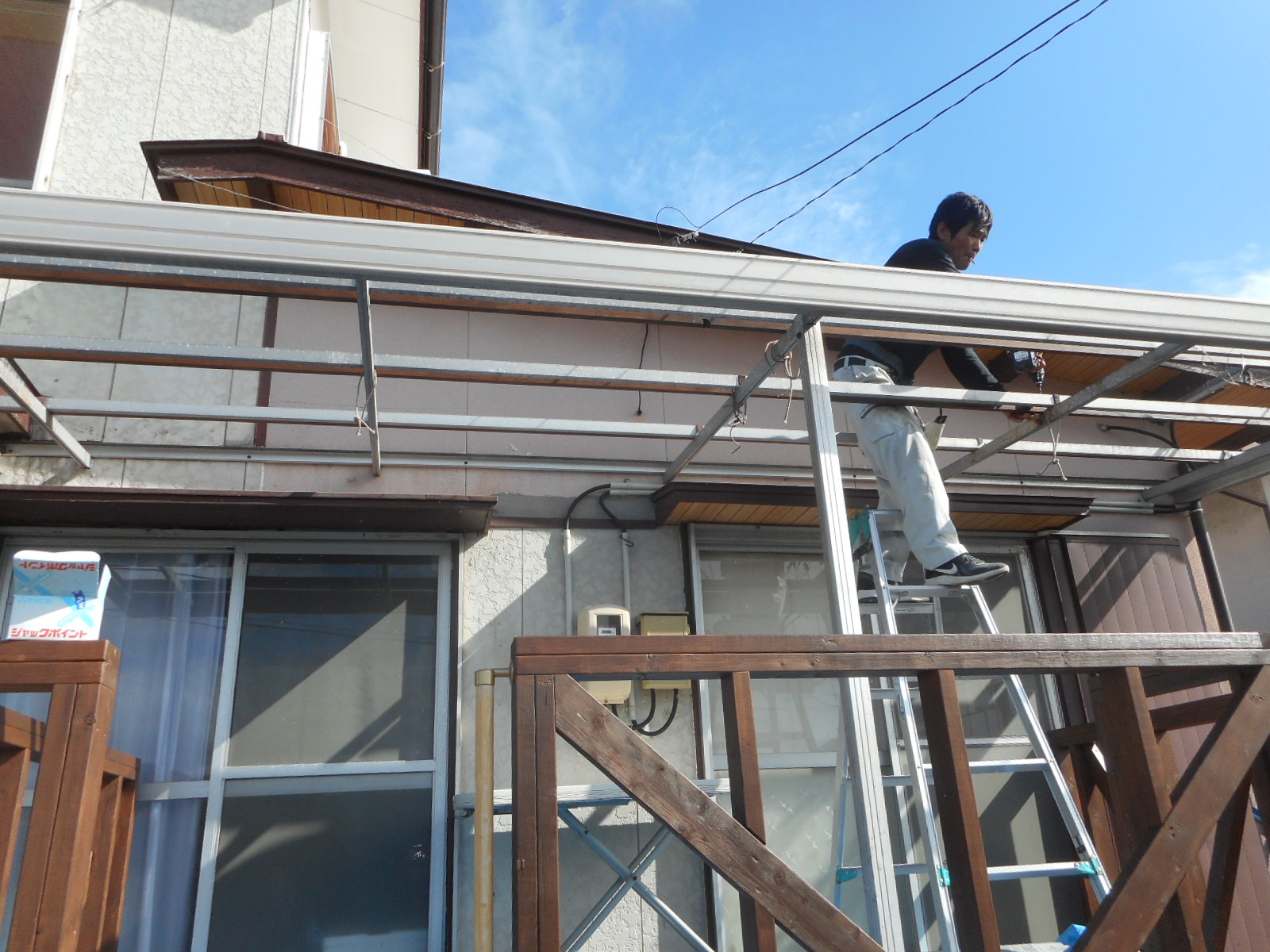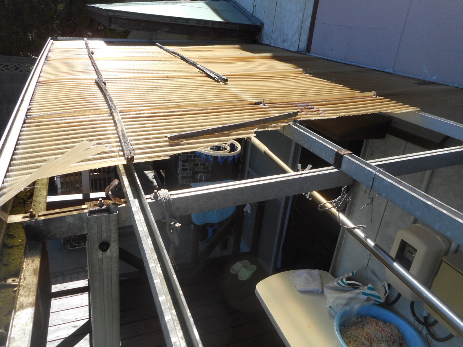 波板を止めるためのモヤの状態も悪いために、タル木でモヤの代わりとなる下地を造り、全面新規の波板を張ることにしました。