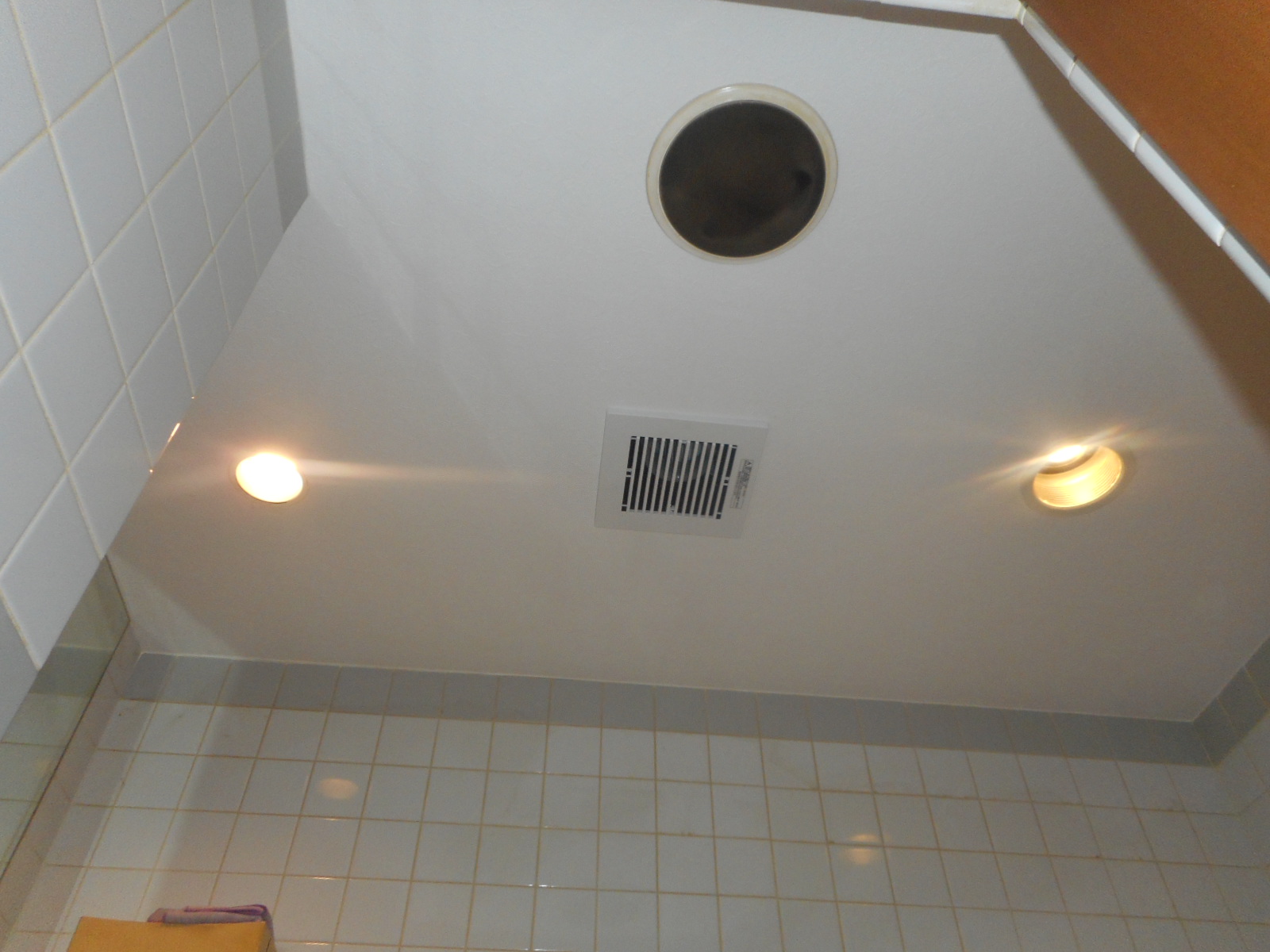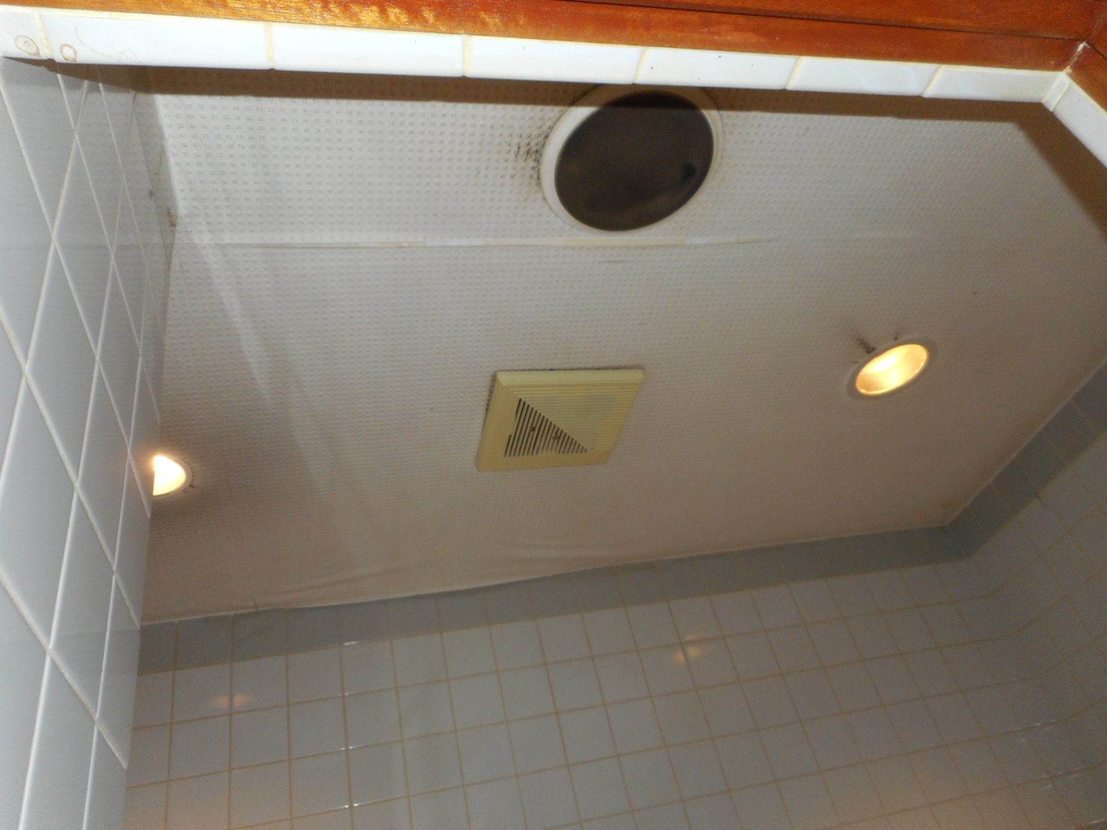 | ビフォー!!(天井) ⇒ | アフター!!(天井のクロスを張替え、換気扇も交換しました) |