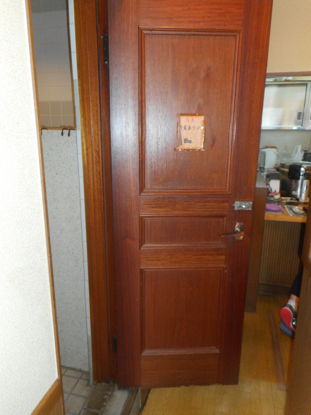 | ビフォー!!(外開き) ⇒ | アフター!!(入り口ドアを新規に制作し、外開きから、内開きにしました) |