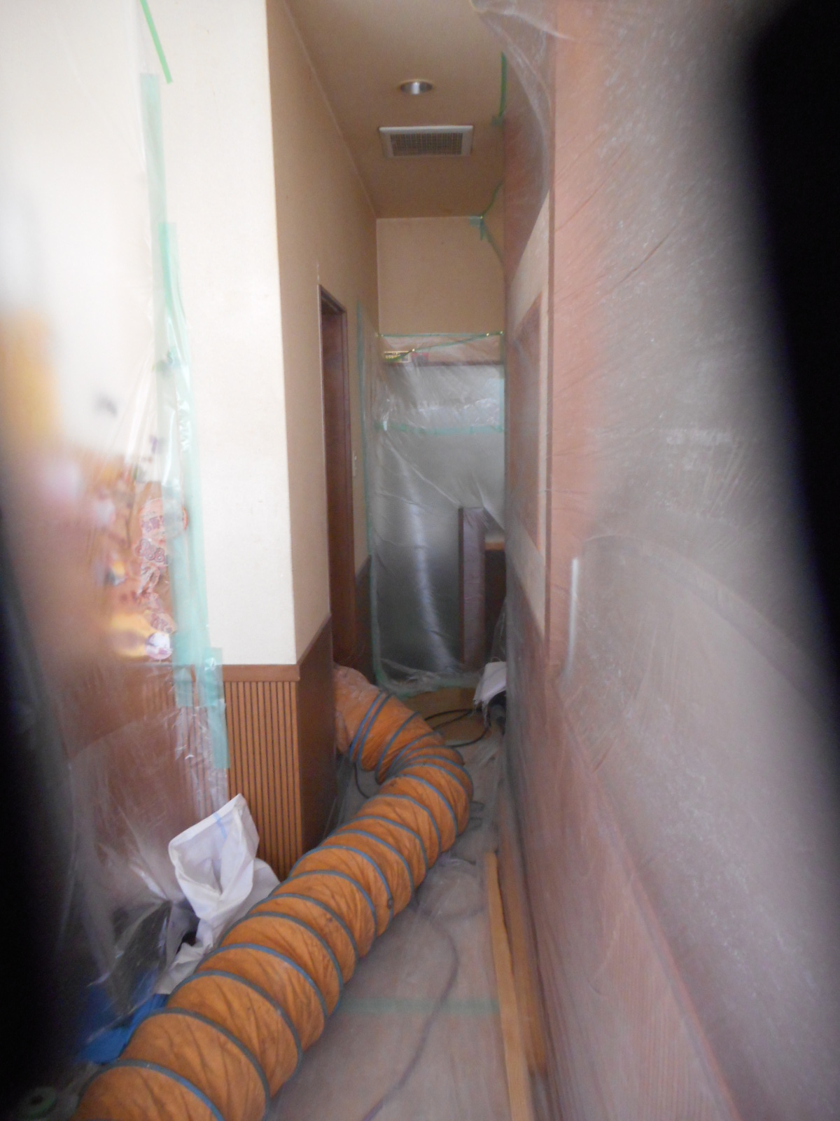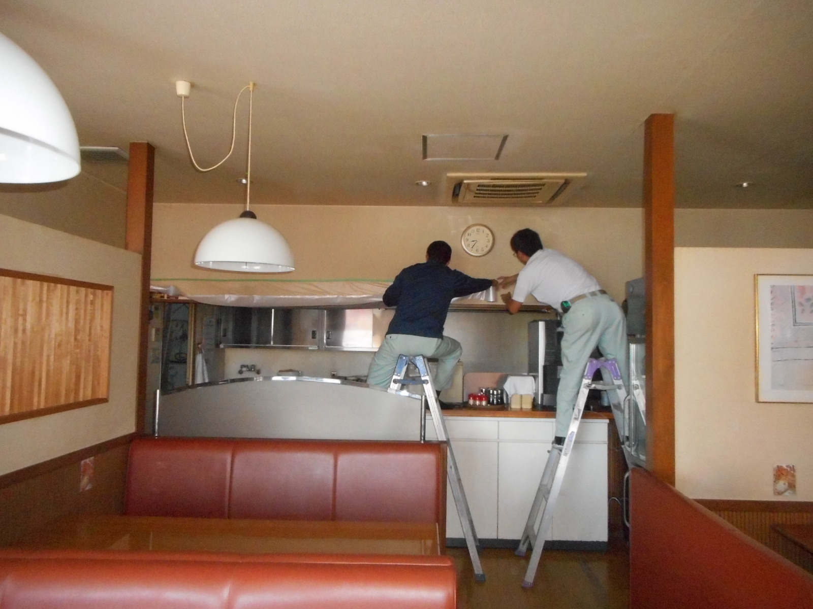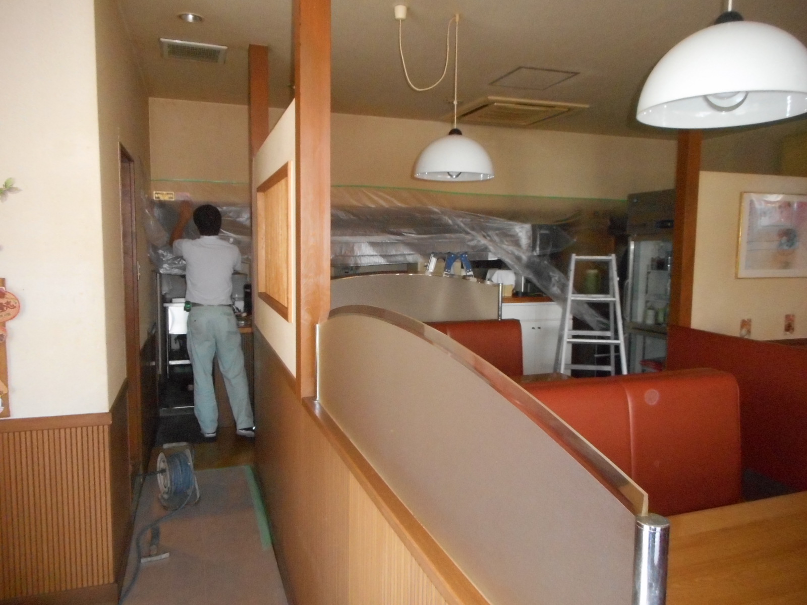 | 最初に、養生をします!! | 厨房にホコリ等が入らない様に、しっかり養生をします!! |