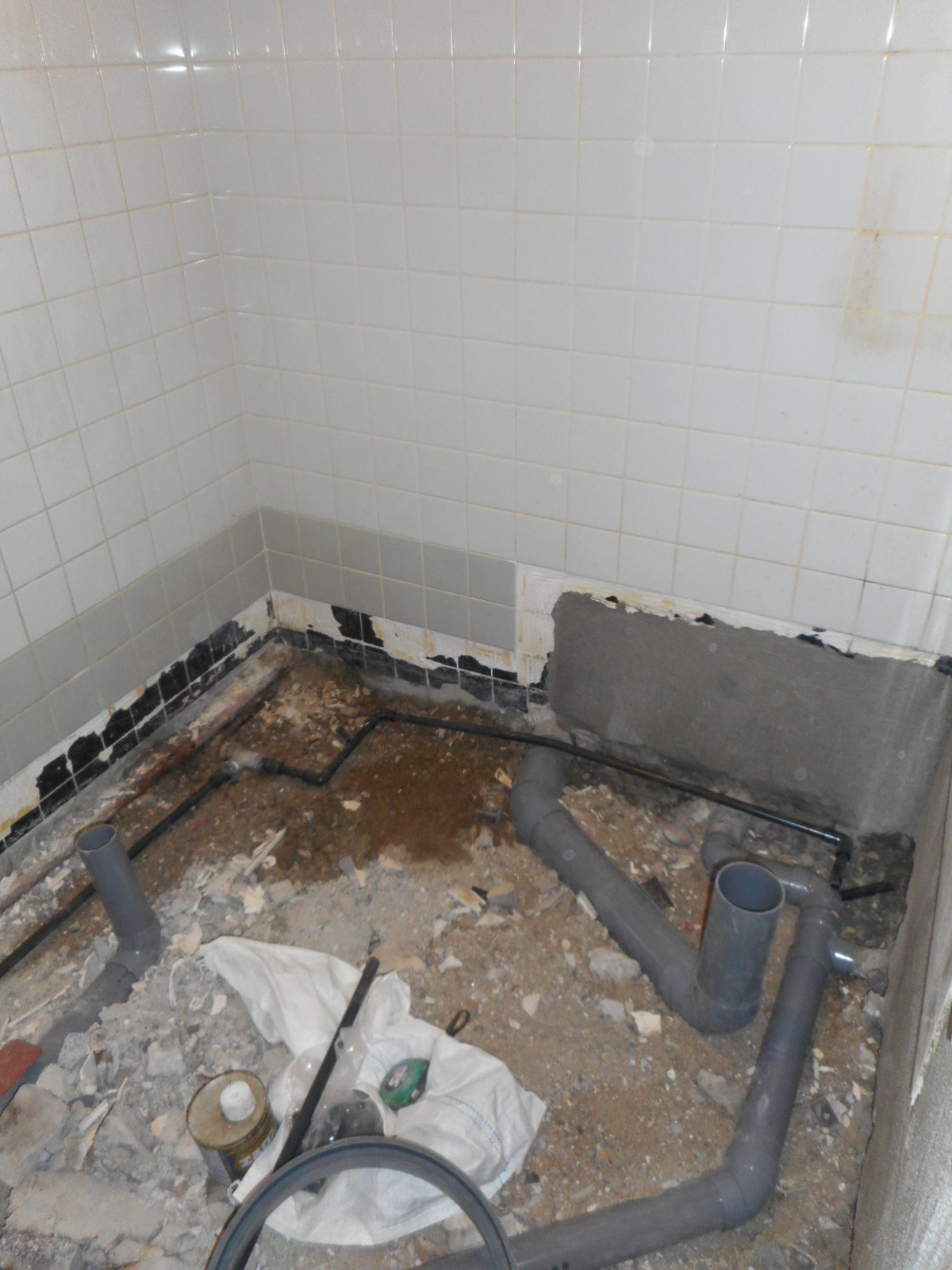 | 便器側の給排水管を移設、整備しました!! | 排水枡を整備し、土間コンを打ちます!! |