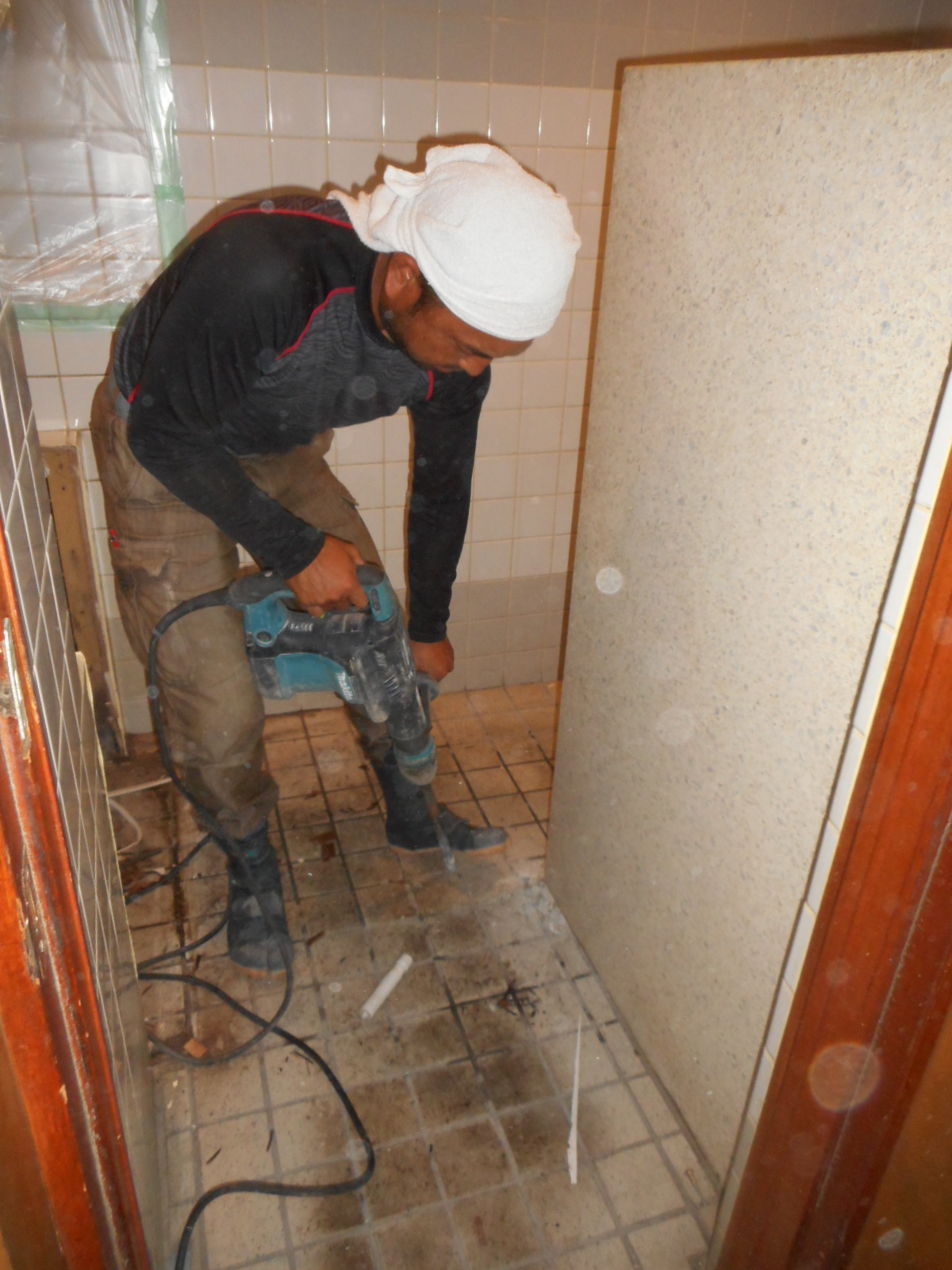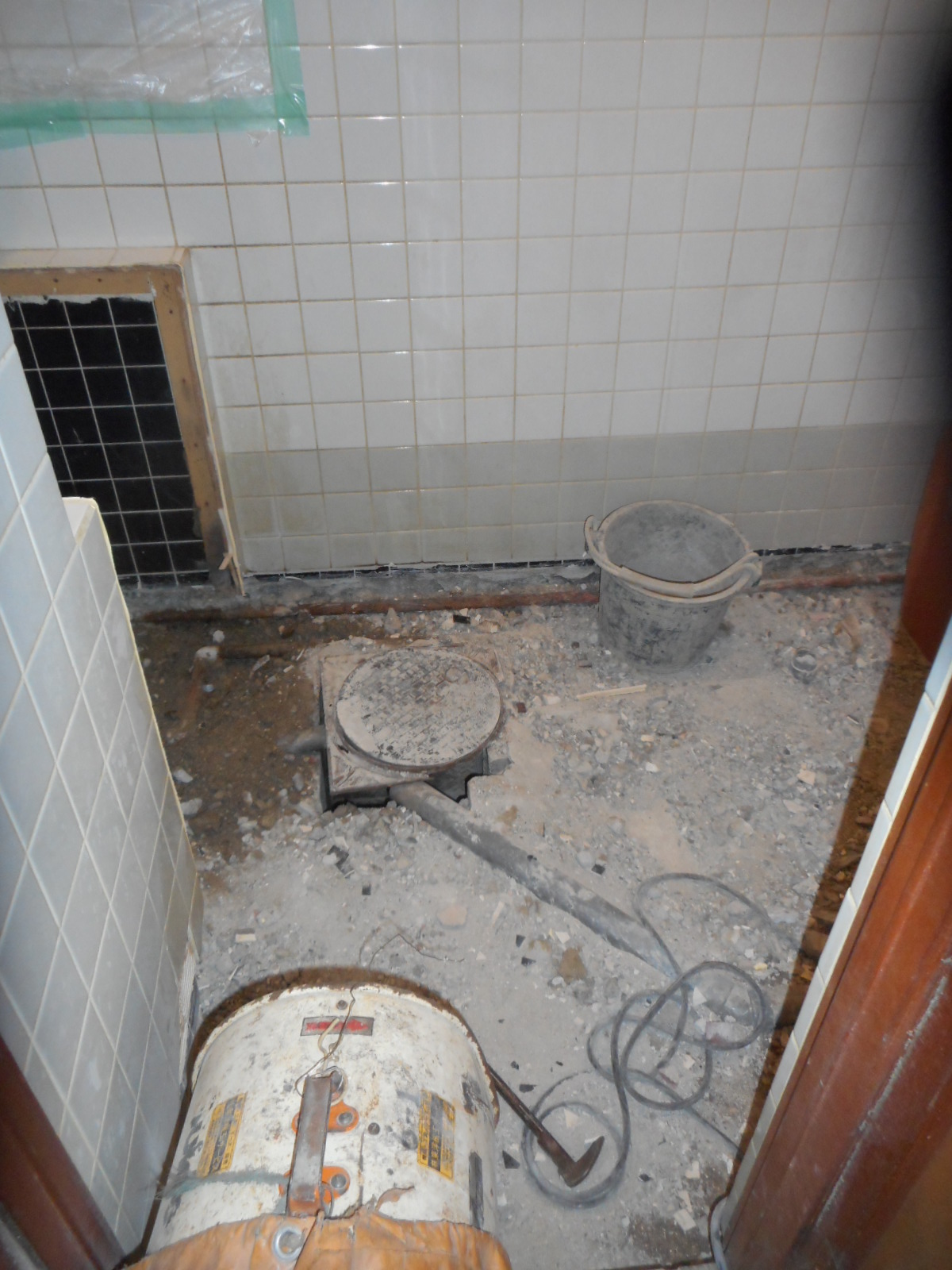 | 仮設の換気ダクトを、トイレ内から外へと設置しました!! | 解体する時のホコリが店内に充満するのを、これで少しでも緩和することが出来ます!! |