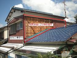 赤線で囲った部分が強風により外壁の大部分が剥がれ、この部分は保険適用に