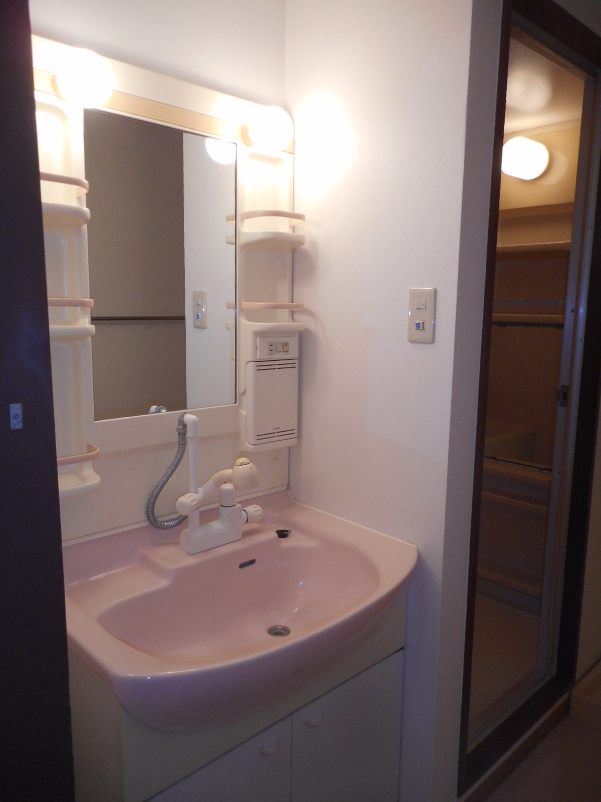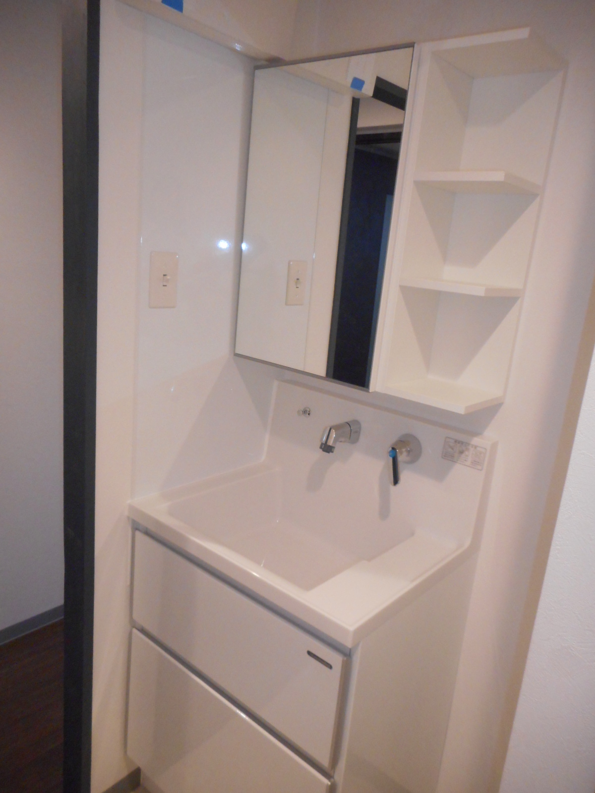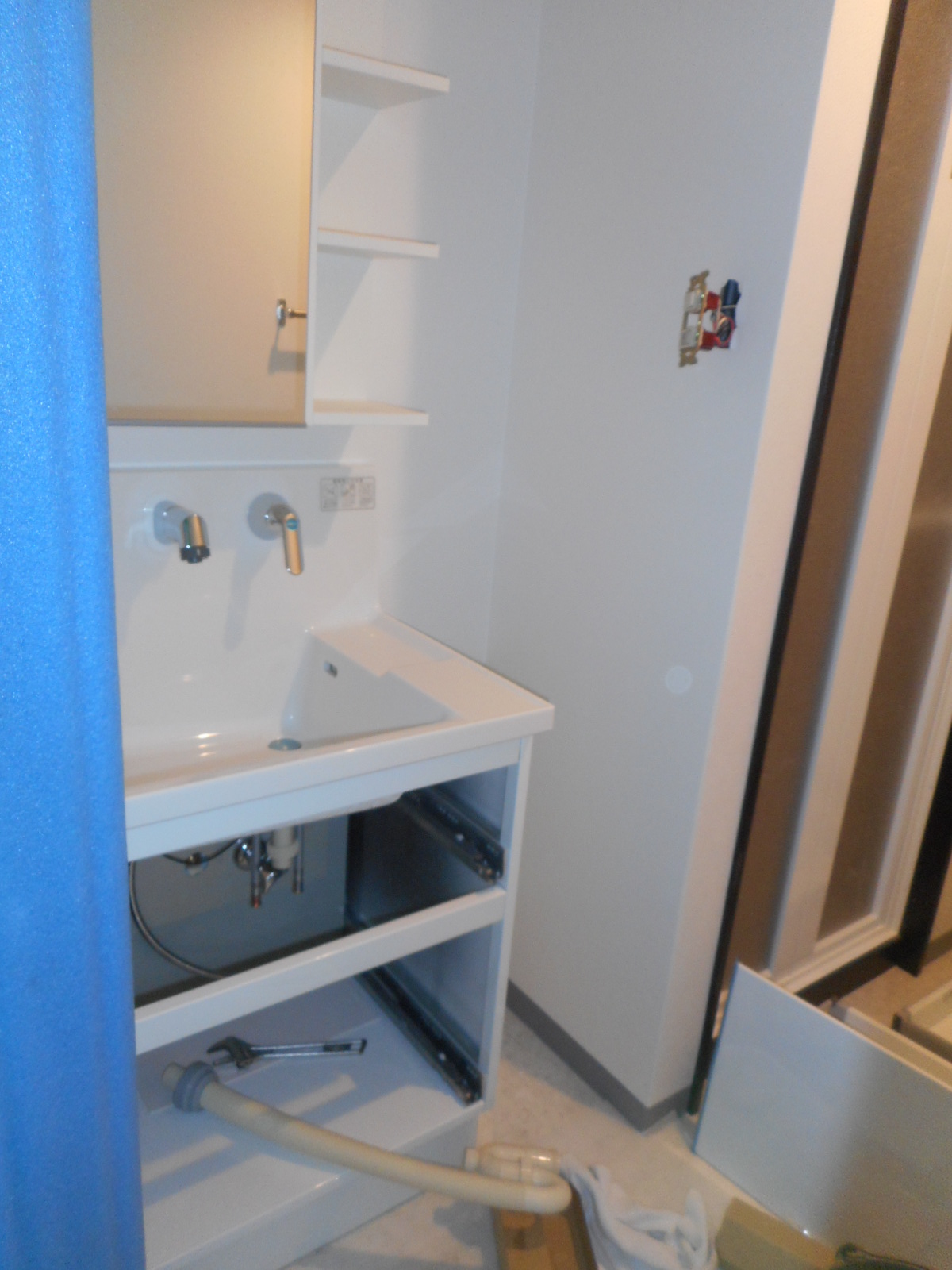 洗面化粧台廻りの、完成です!! 上の鏡と収納棚は、施主さんが用意しました!!