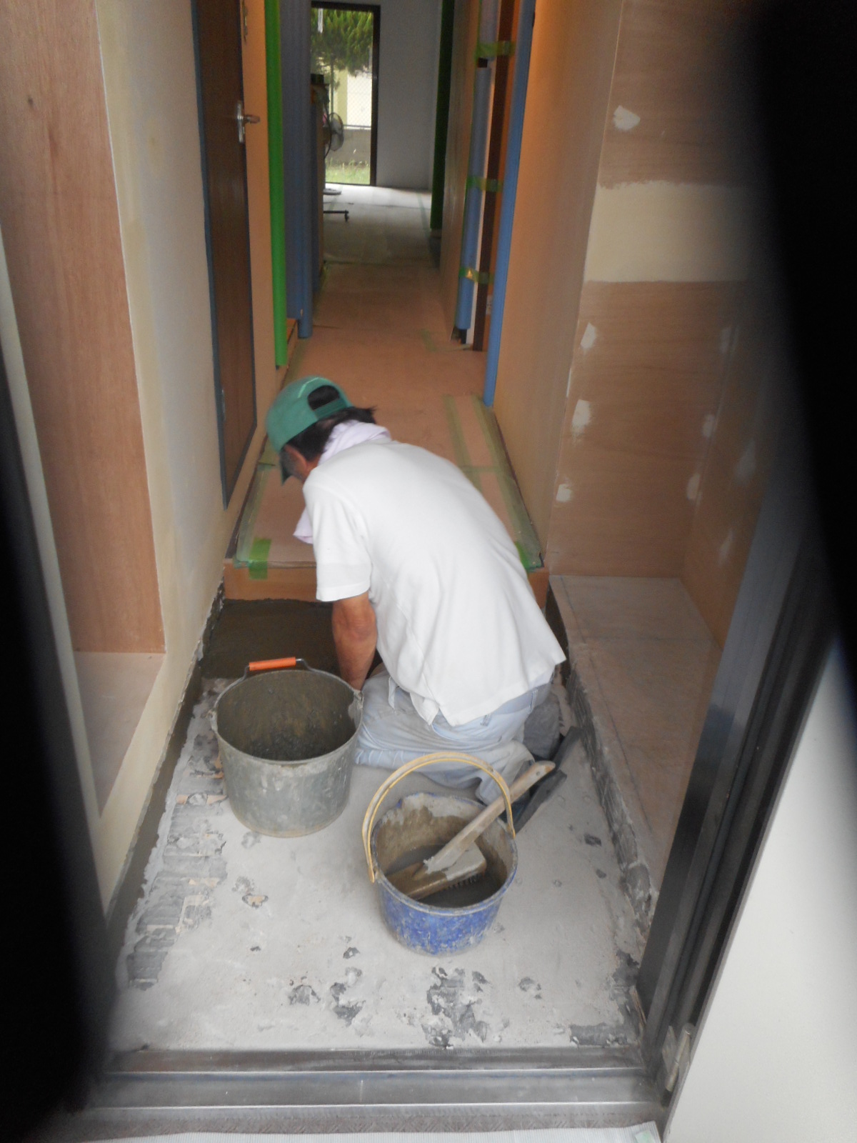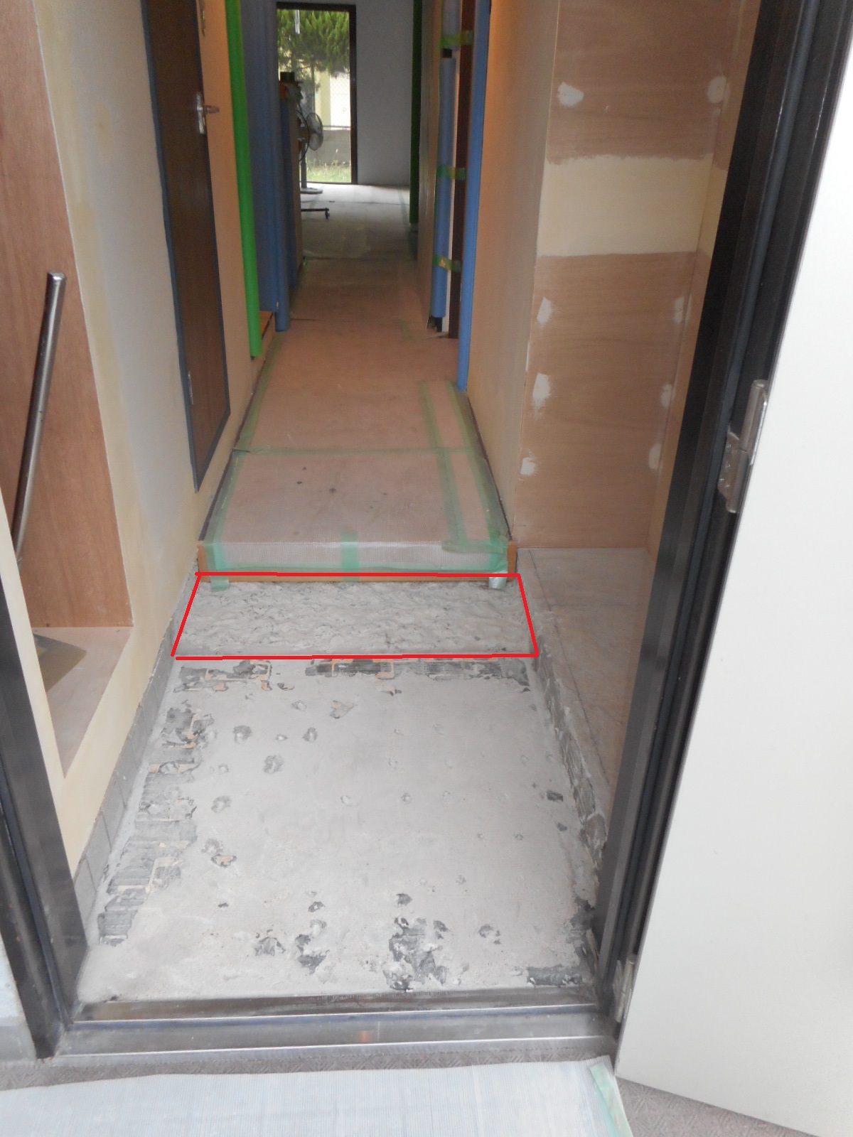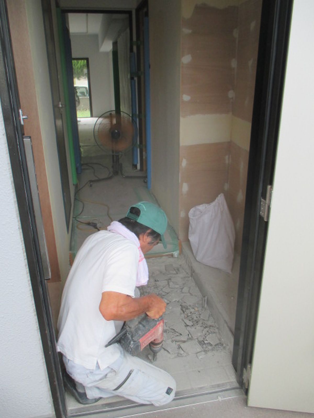 玄関の土間をハツリます!!(両側の収納棚も解体撤去し、内装の下地まで完了しています) 奥の赤枠部分程、廊下をカットし土間を広くします!!