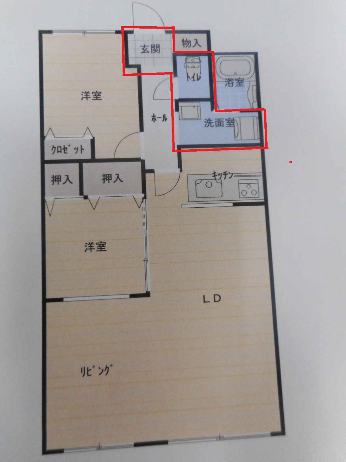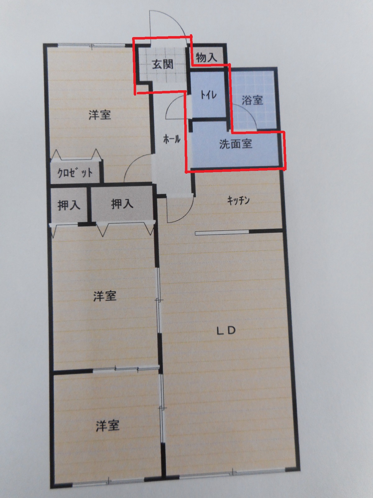 ※今回は赤枠で囲った洗面所、トイレ、玄関廻りの改修を紹介します。