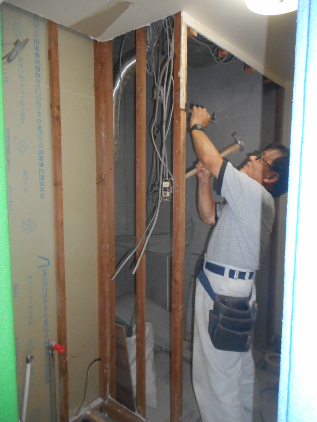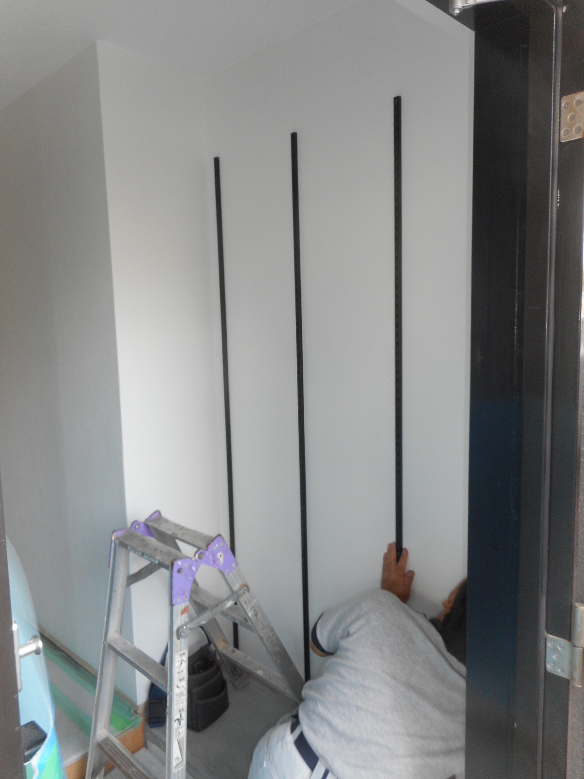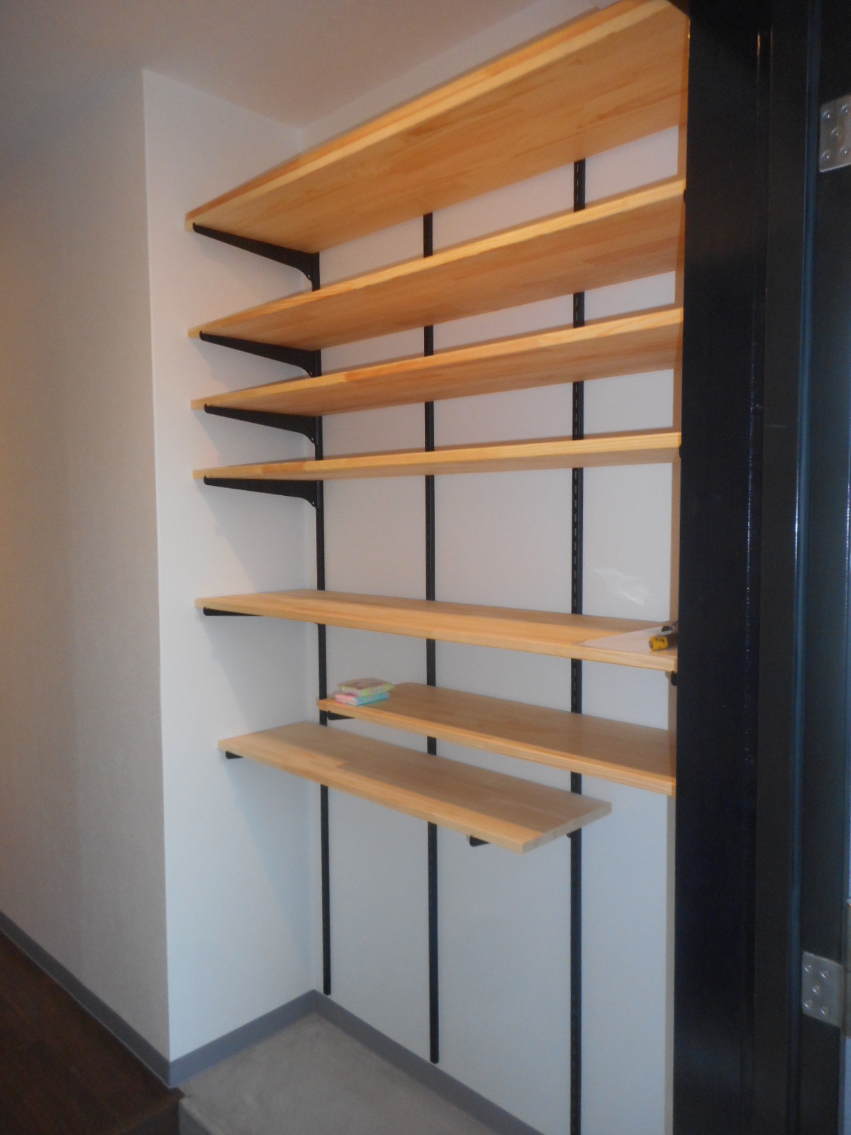 収納部分の内装後、棚板をセットする下地部材を取付けます!! 棚板をセットし、収納ソペースの完成です!!