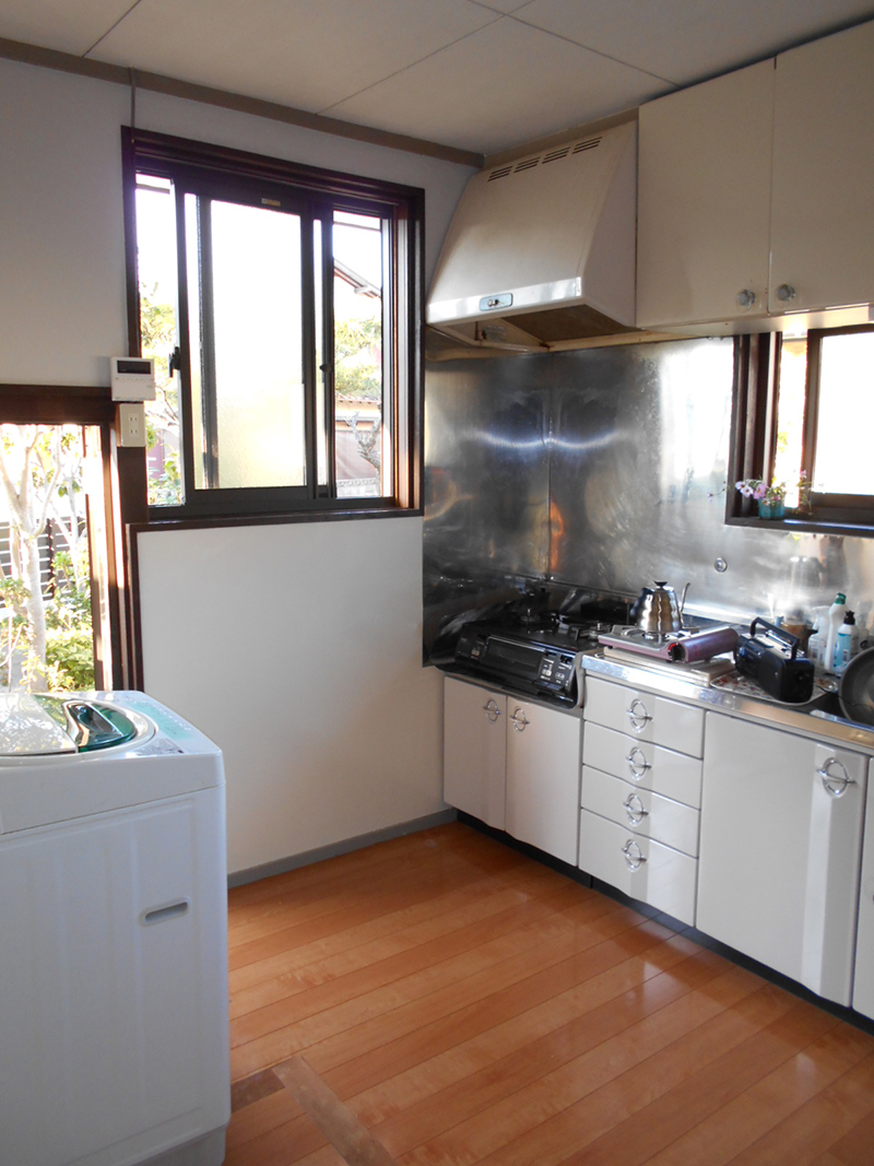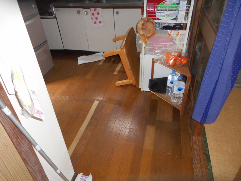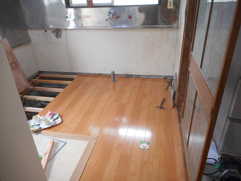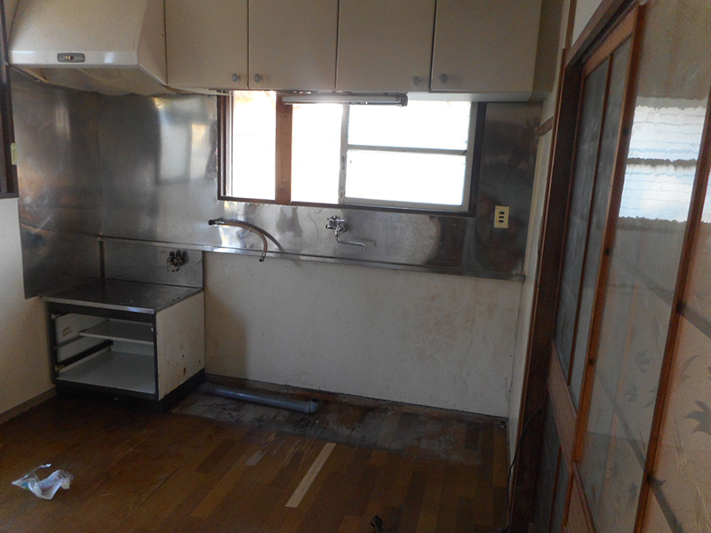 | 古くなった流し台を入替え、瞬間湯沸かし器を撤去し現在の灯油ボイレからガス給湯器に切り替えそこからお湯を供給する様に改修します!! | 床はブカブカして状態が悪いので、全面解体し改修します。その他木製の窓2箇所をアルミサッシに交換します!! |