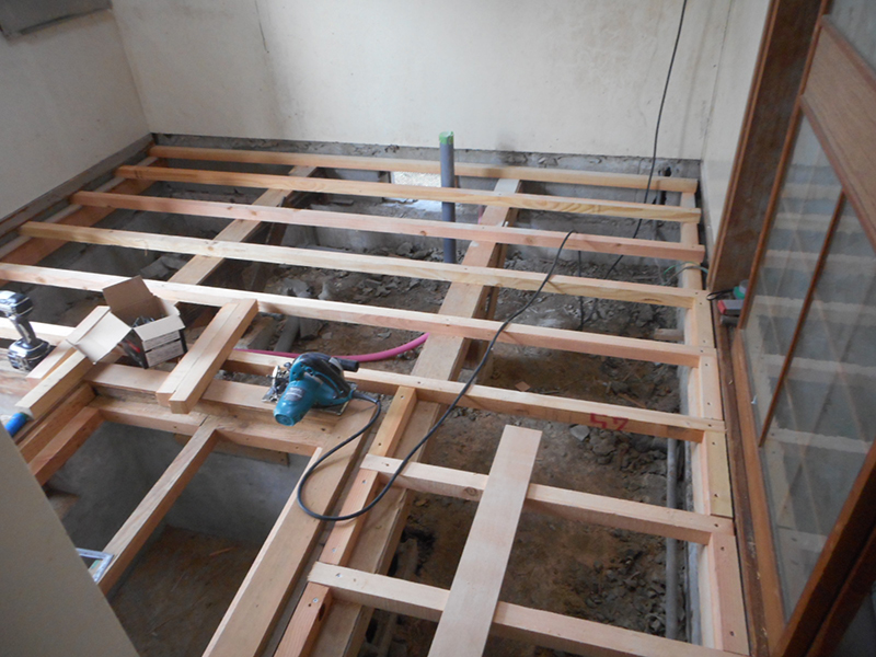| 新規の根太を、施工しました!! | 新規のフロアを、施工して行きます!! |