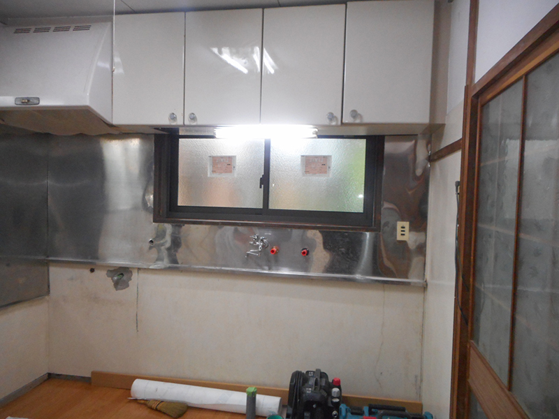 | 流し台の前の木製窓も、アルミサッシに交換しました!! | 新規の流し台を、設置します!! |