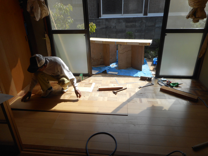 庭で、材料を加工しています!! 既存上部より新規フロア材を、施工して行きます!!