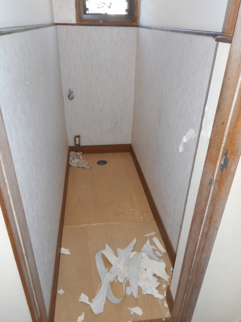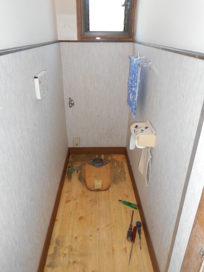 便器等を、一時撤去しました!! 床を解体し、下地補強後防水合板を張りました!!
