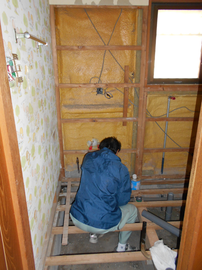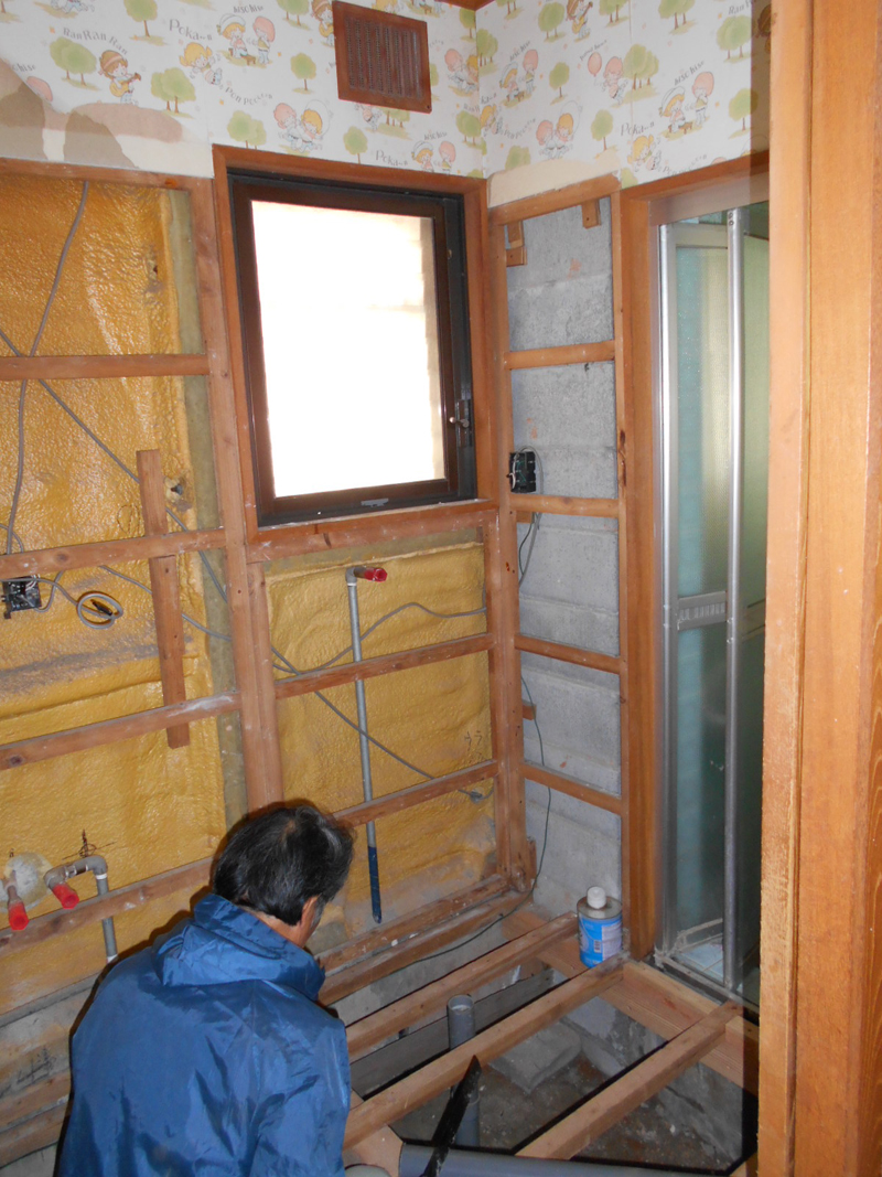 | 既存の化粧台を撤去後、壁と床を解体しました!! | 設備屋さんが新規化粧台用の給水、給湯、排水管の整備をします!! |