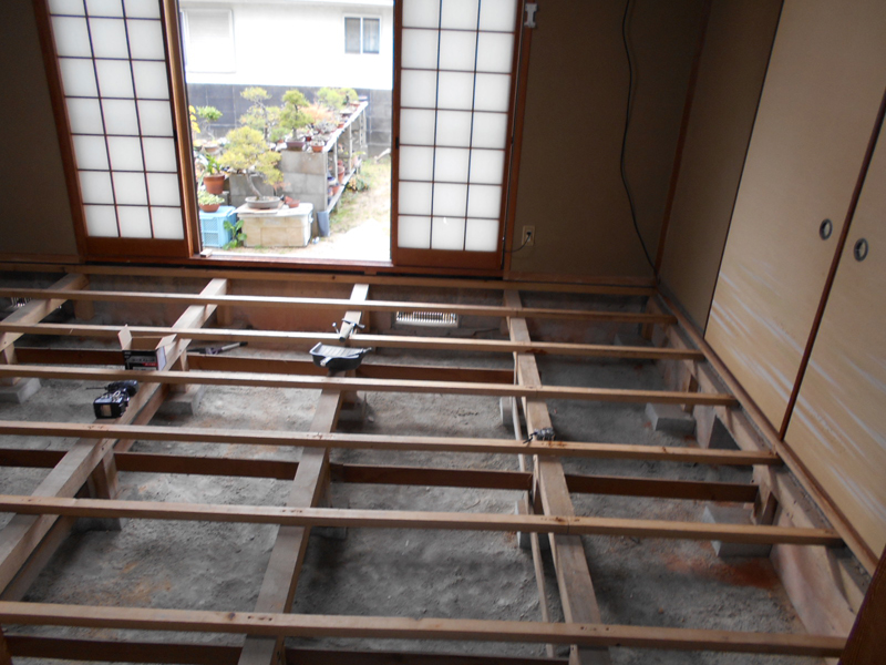 ・床がブカブカするので全面解体し、下地整備ごCFを施工します。