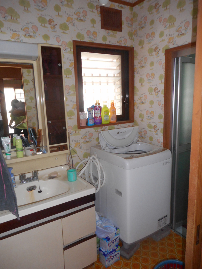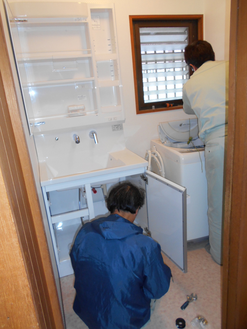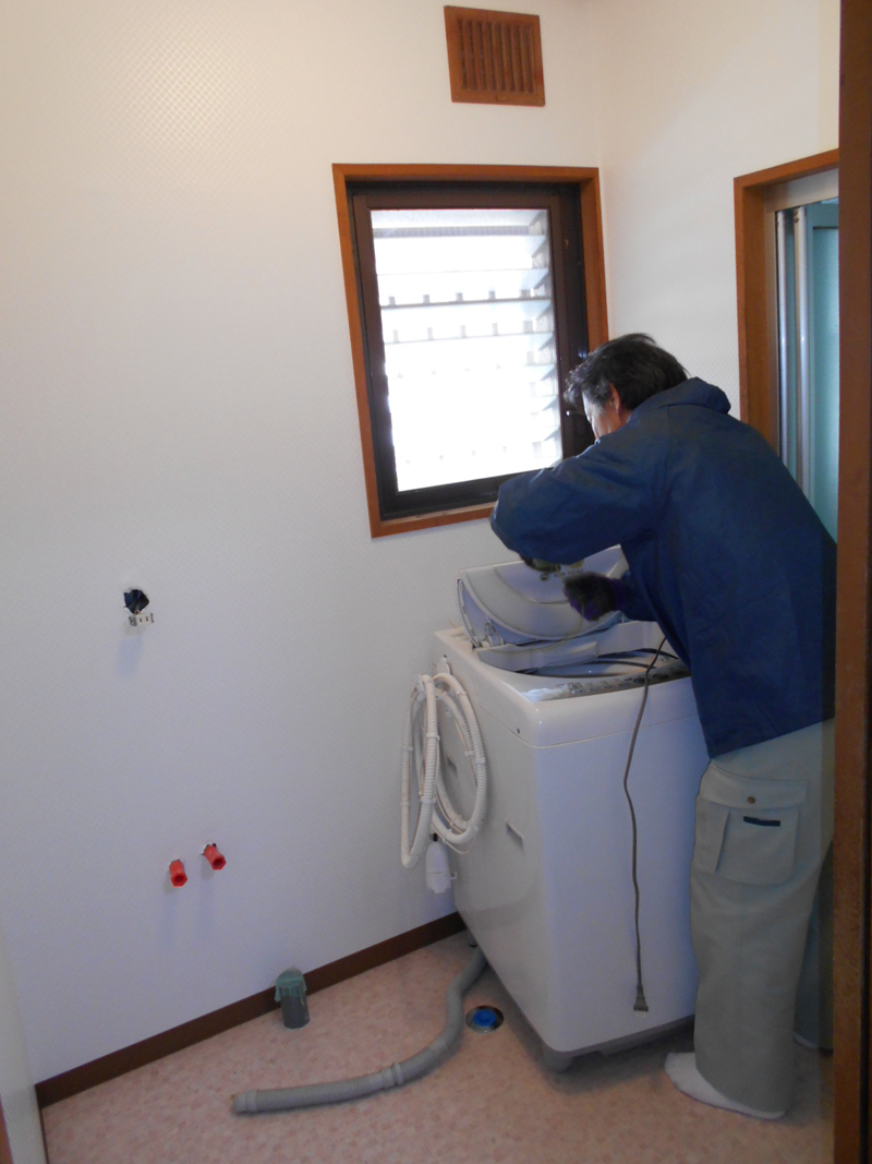 | 内装完了後、洗濯機を元に戻します!! | 新規の洗面化粧台を、組付けます!! |