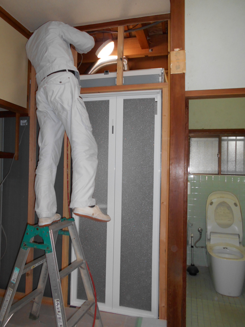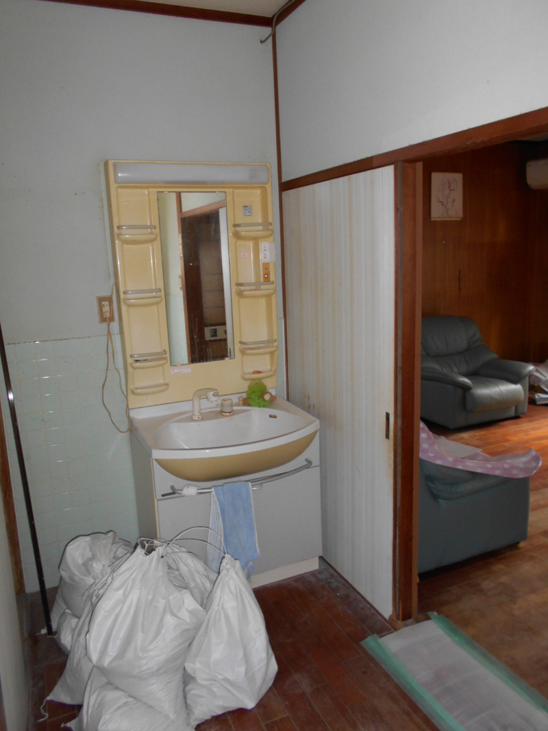 古くなった化粧台を交換し、壁の一部のクロス張替えと床のCFも張替え、入り口の引き戸の状態が悪いので、新規に造り替えます。
