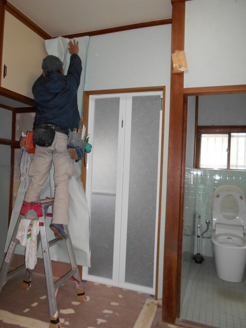 | 組立が終わったら、入り口廻りの壁の造作をします!! | クロス屋さんが、クロスを張って行きます!! |