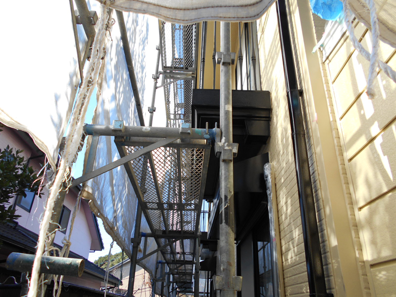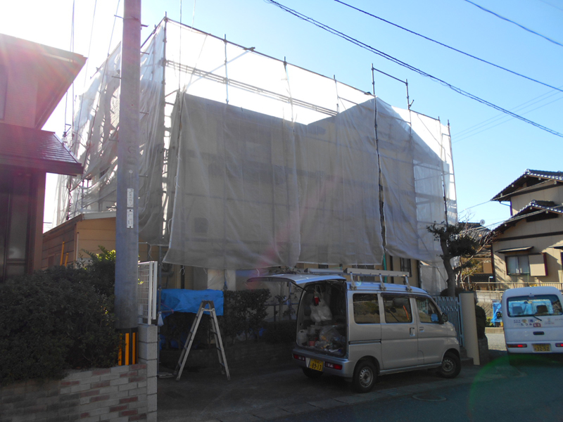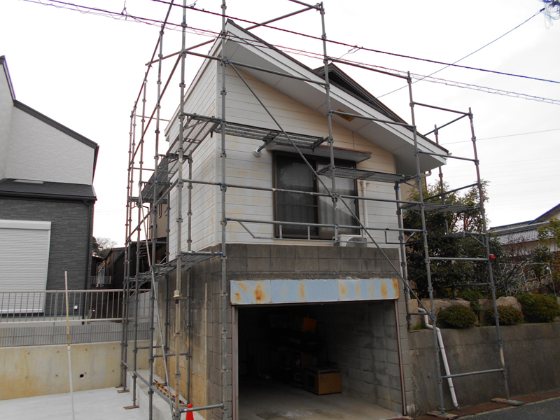 | 足場を組み、養生をしました!! | 高圧洗浄後、順次塗装をします!! |