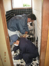 いつもの様に便器や備品の撤去後腰壁のタイルの解体をます!!
