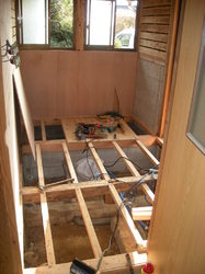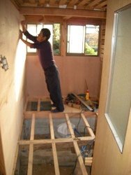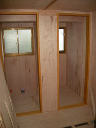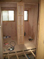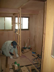 トイレ部分の床、壁、天井廻りにコンパネを施工後、トイレを2室設けるため間仕切り壁を造る!!