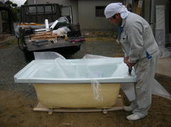 現場に設備、備品を運び込み外で浴槽の穴明け加工等の準備作業を行います!!