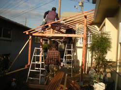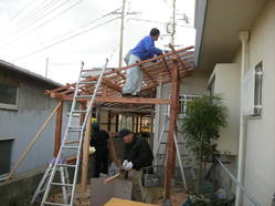 柱を立て骨組みをし、屋根材を張るための下地のタル木を施工して行きます!!