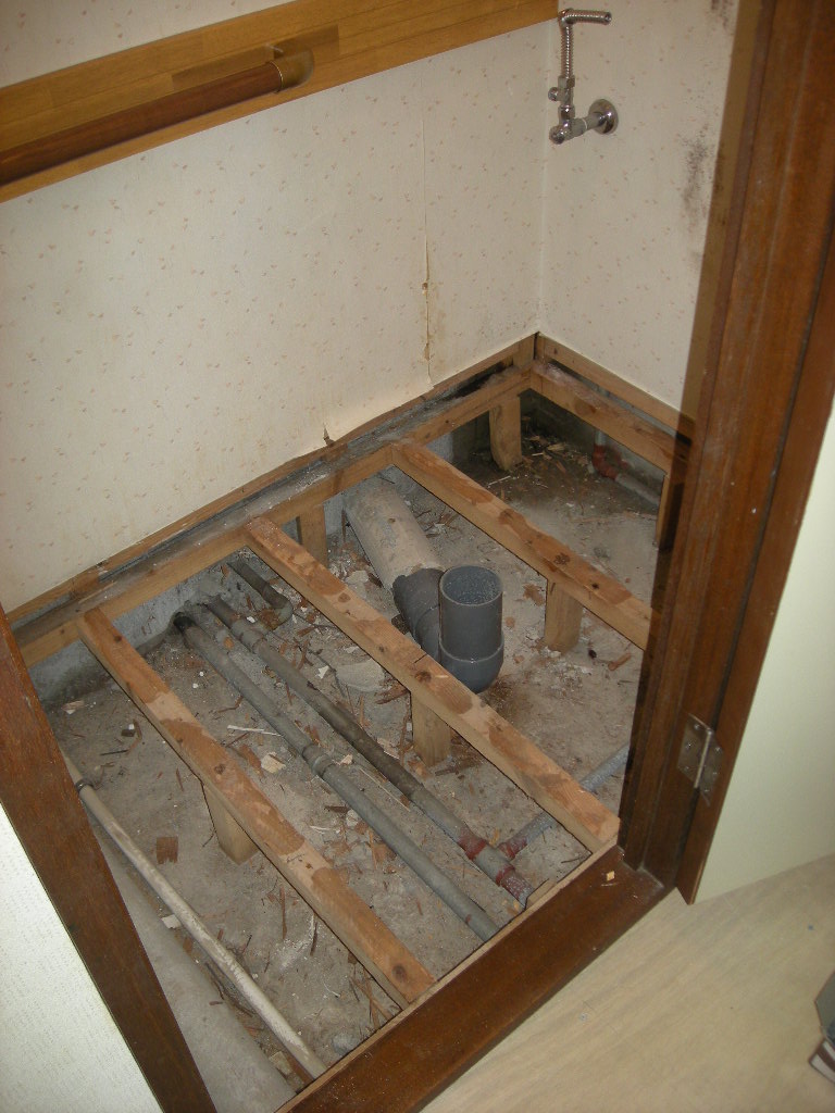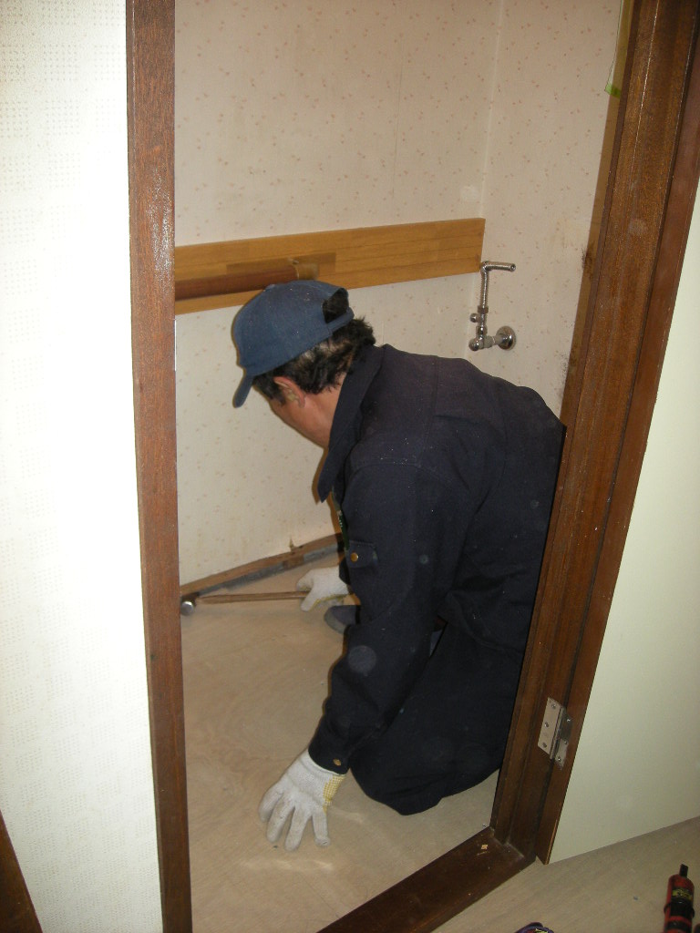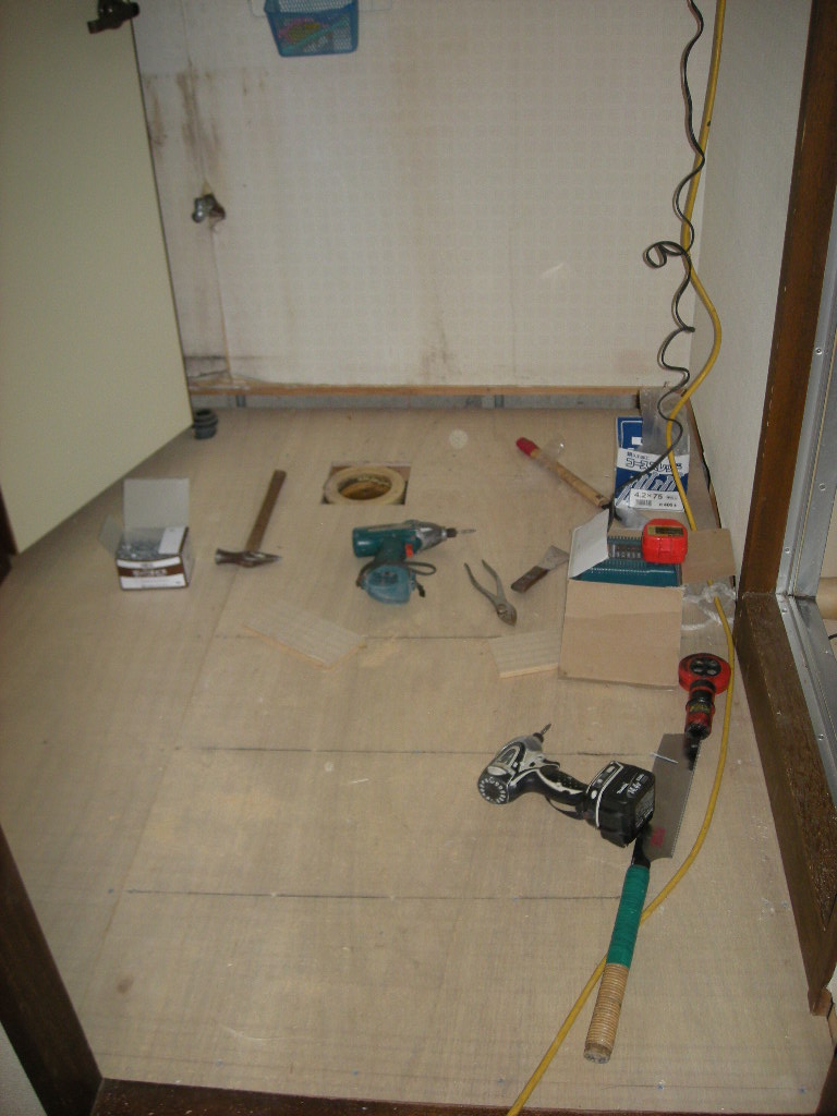 平行して洗面所の床も解体後、下地コンパネを張る!!