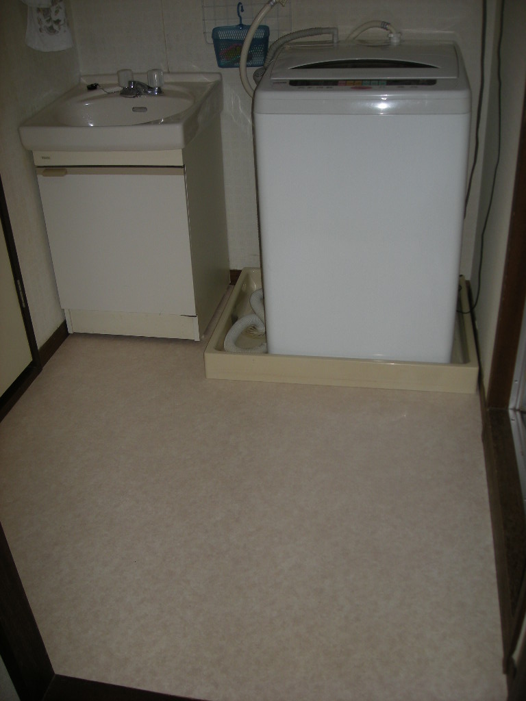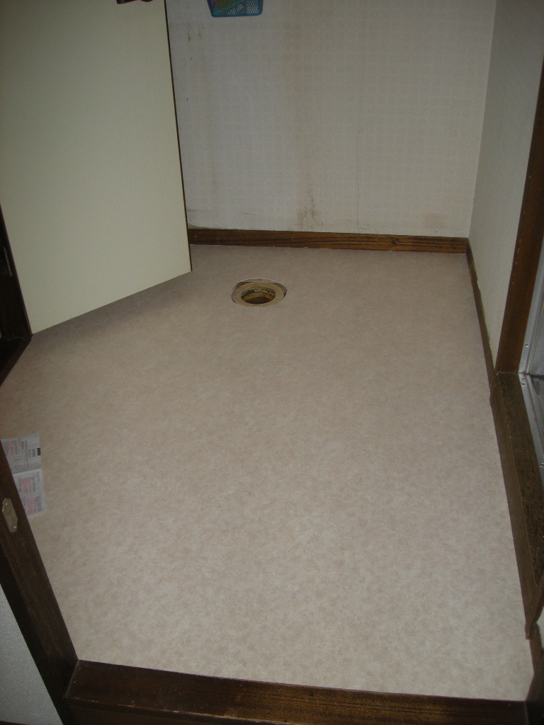 既存の床材を解体し下地づくり後クッションフロアーを張り、再度便器や化粧台・洗濯機