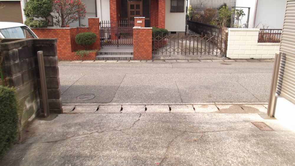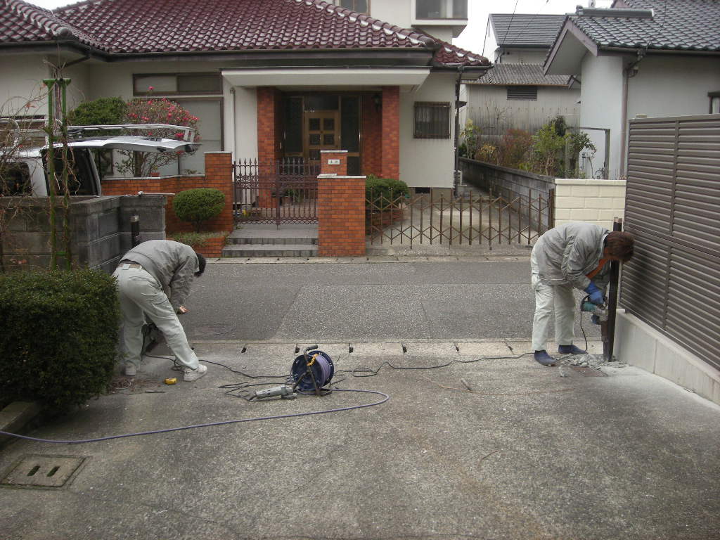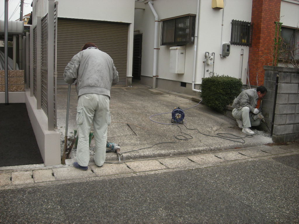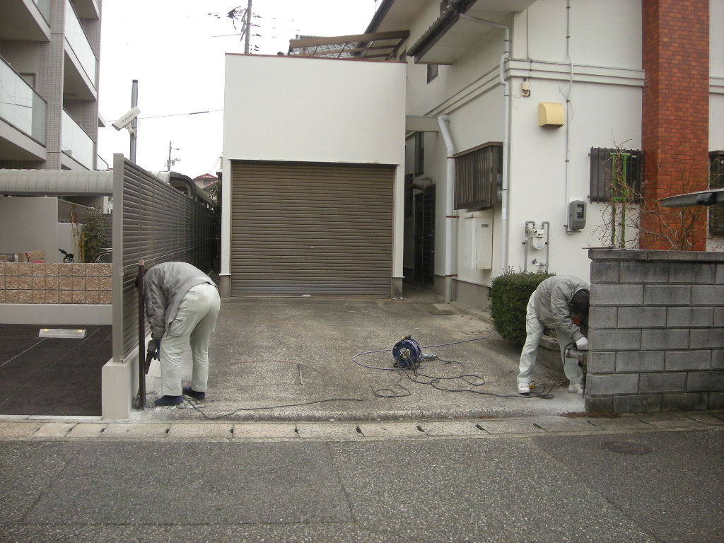既存の門扉は壊れてすでに無いため、残った柱の撤去から始めます!!