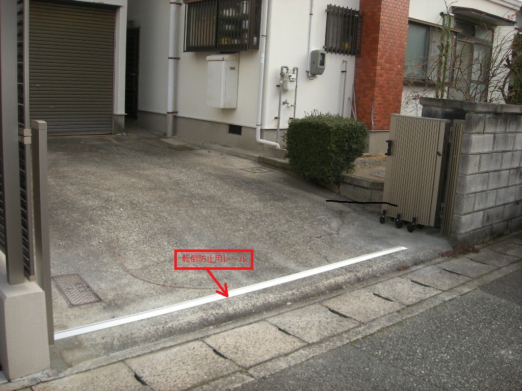 取付けてほしいとのことなので、転倒防止用レールの付いた、丈夫な収縮門扉を