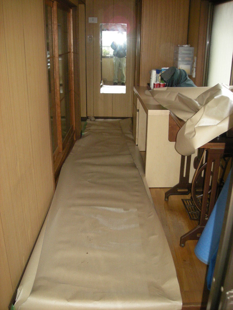 *作業に入る前に室内の養生をする。