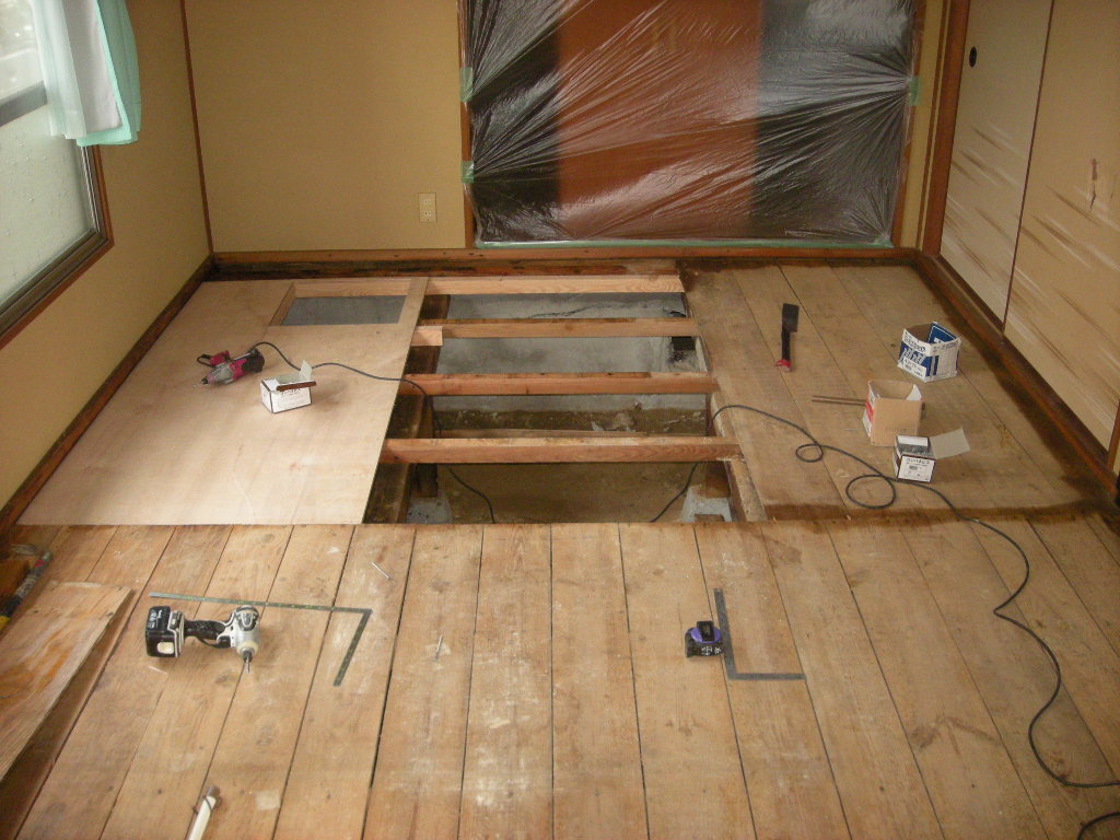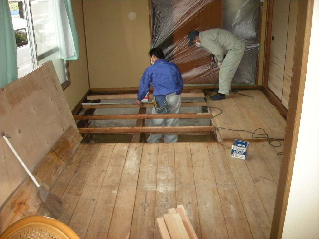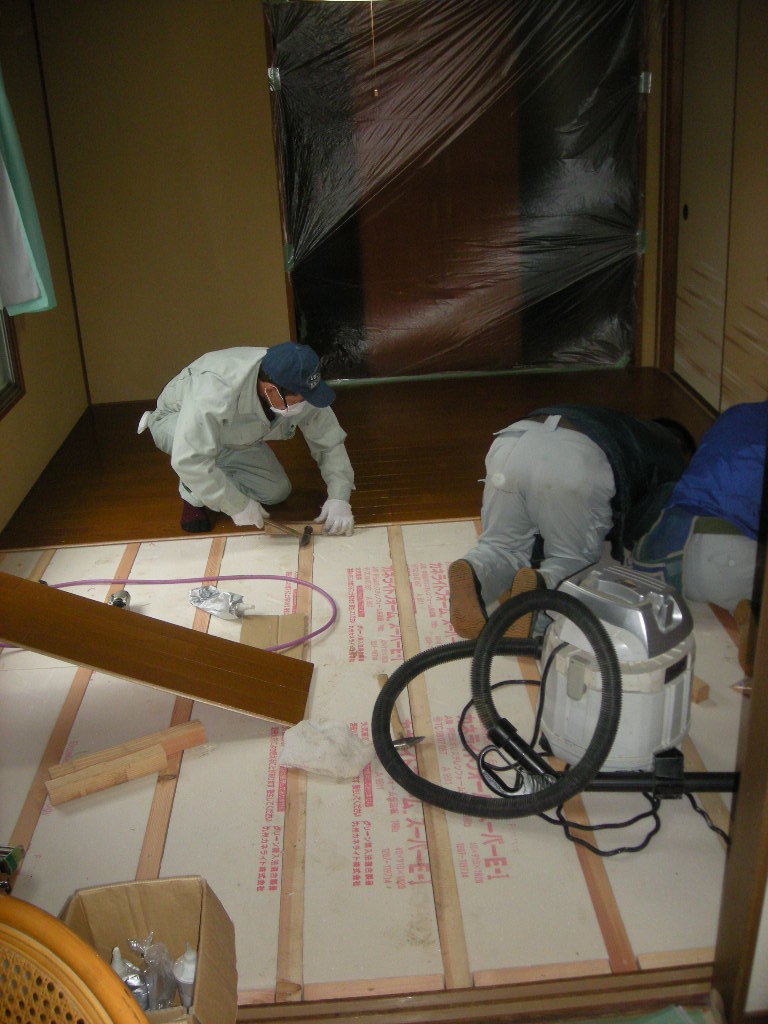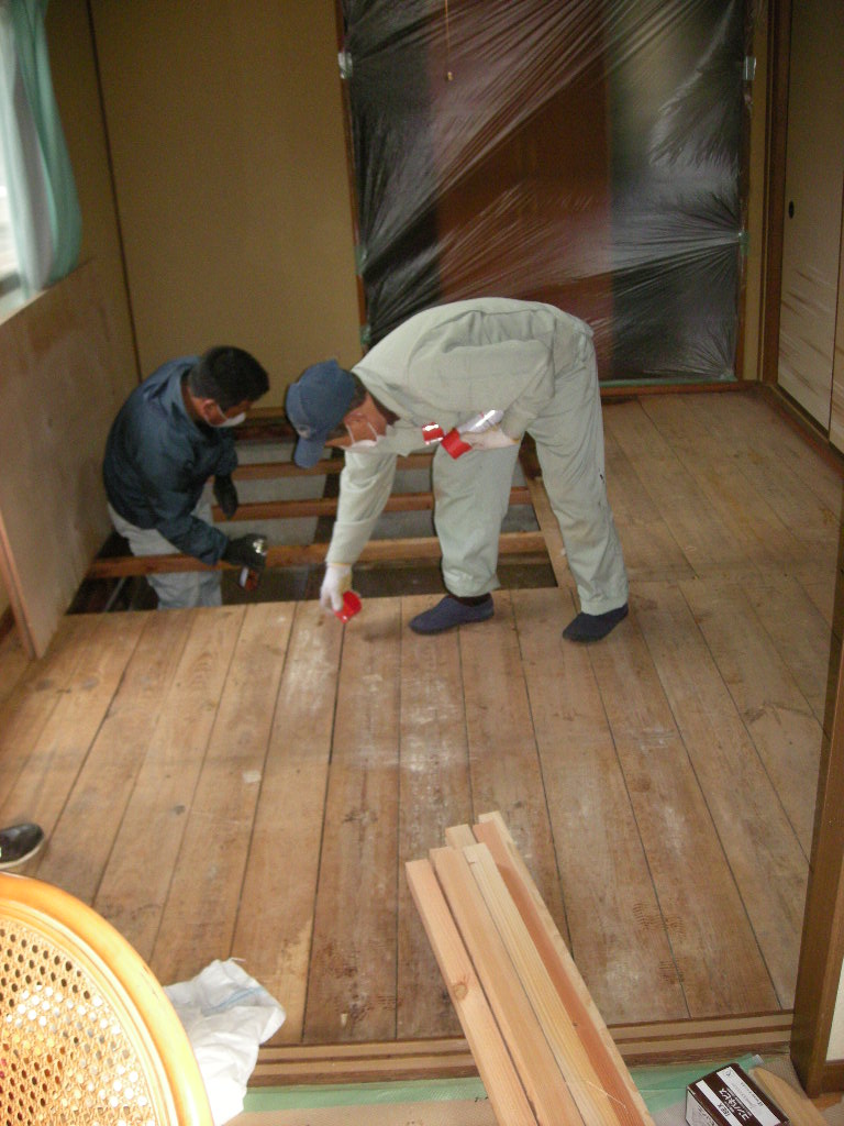 畳を撤去したところ一部シロアリに食われている座板があったので、これも撤去し根太部分や廻りにシロアリの防除剤を散布しました!!
