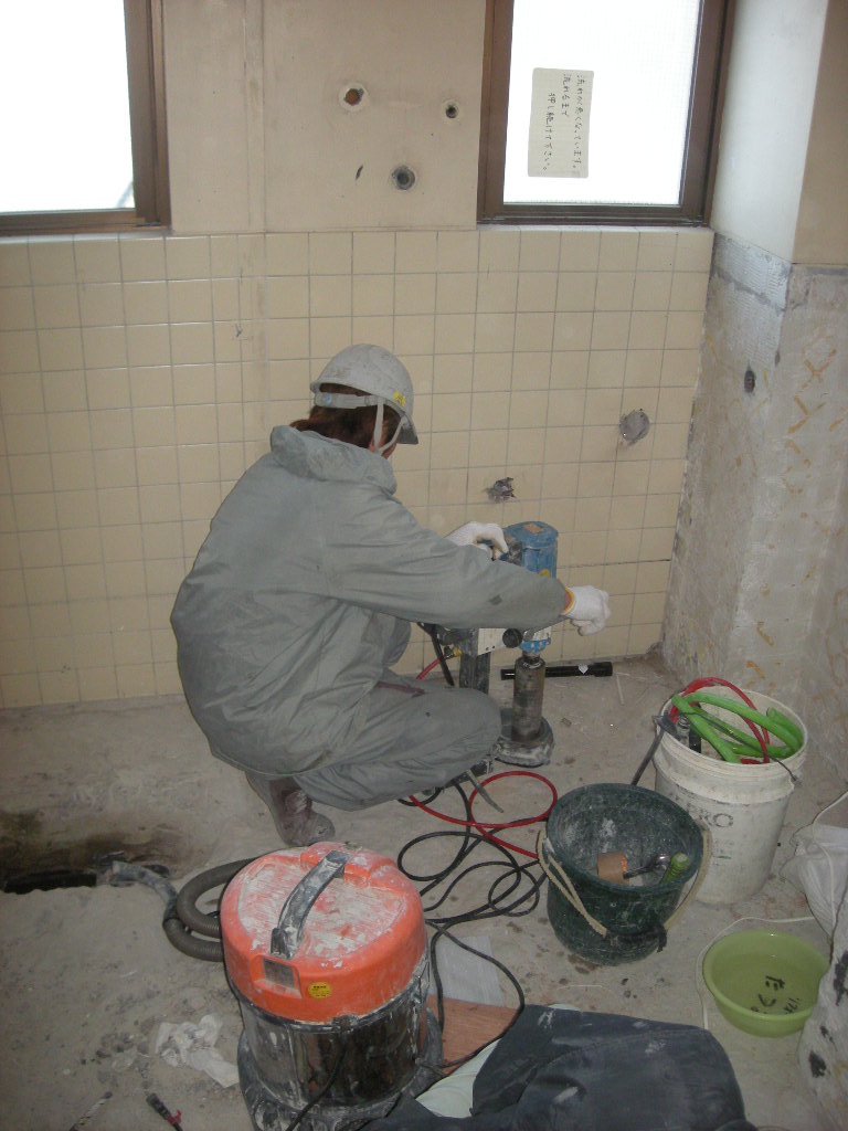 下の配管を傷付けない様に慎重にコアドリルで穴を明けてて行く!!