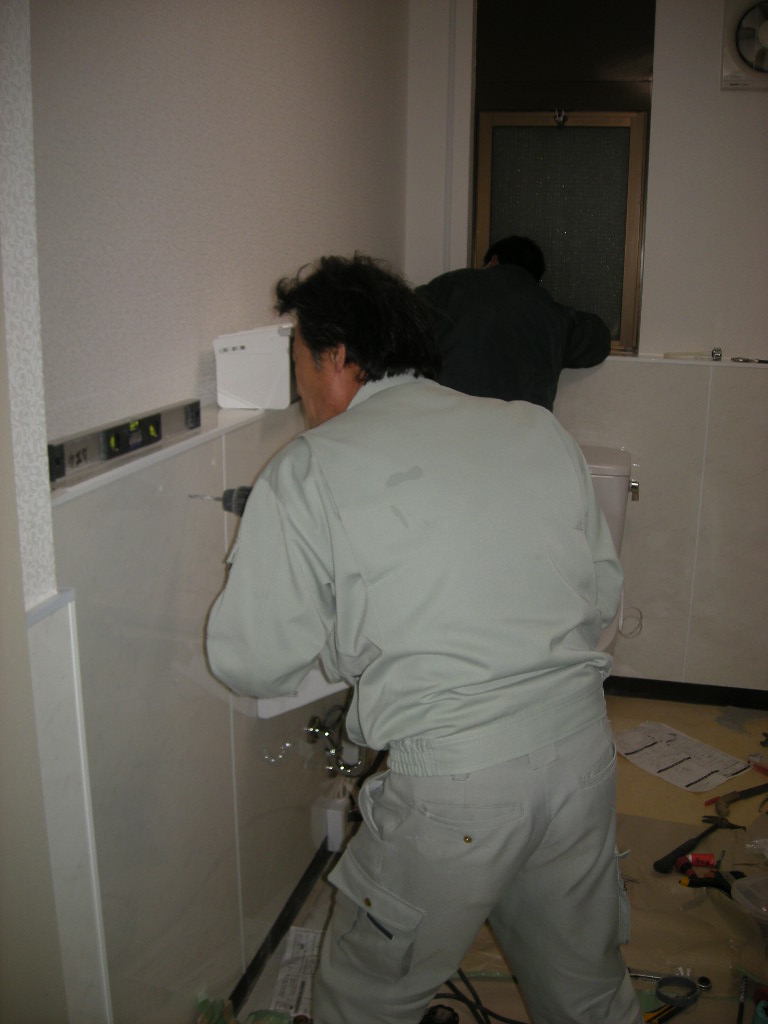 ①、手洗い器を取付けるための金具の下穴を明けます!!
