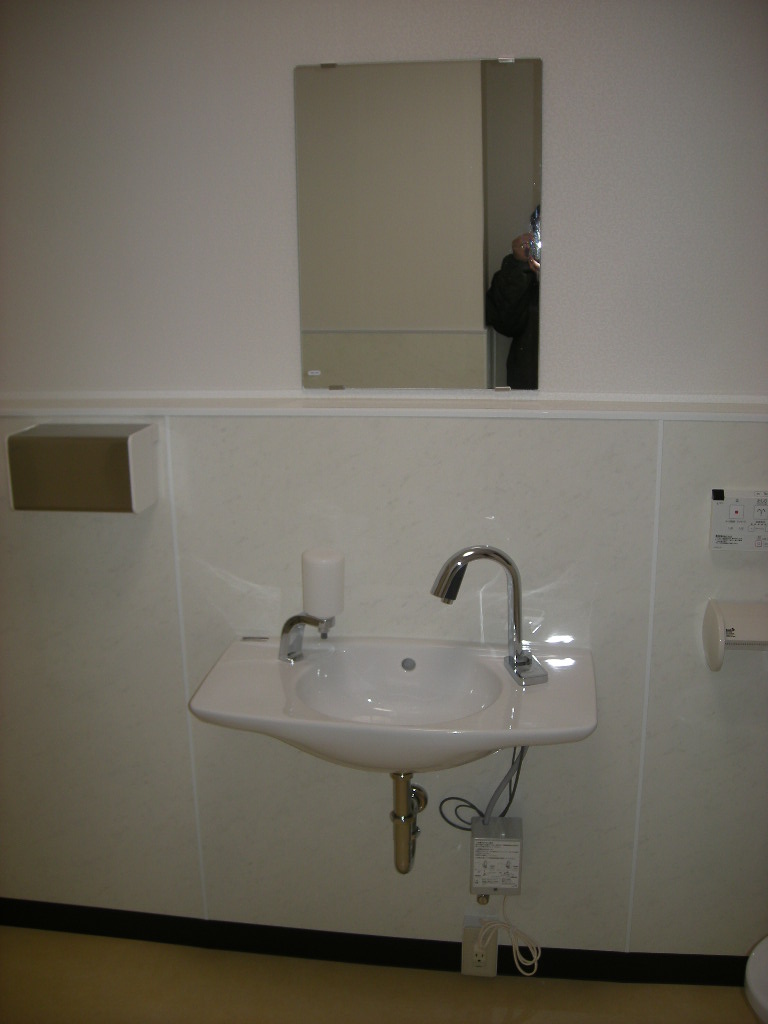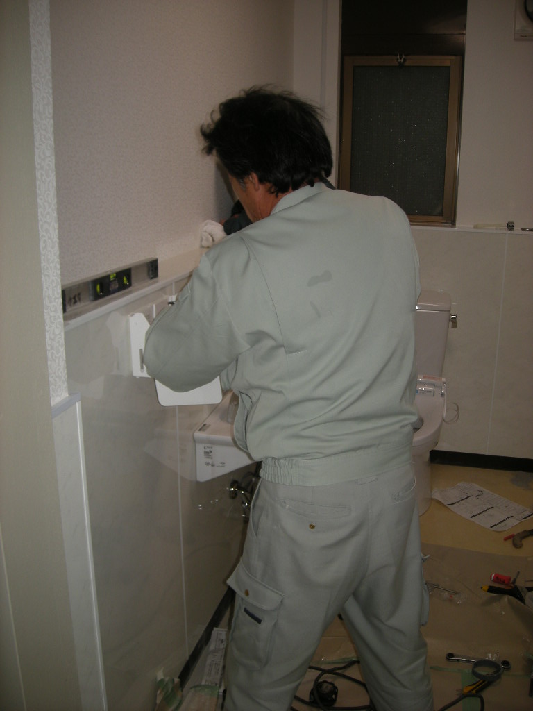 ⑩、左側の壁に手洗い器、紙巻器、リモコン、ペーパーホルダー、鏡の取付けの完了です!!