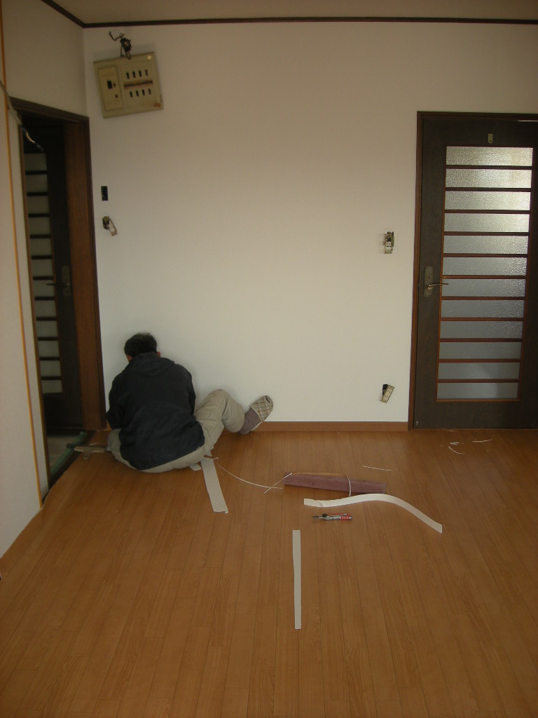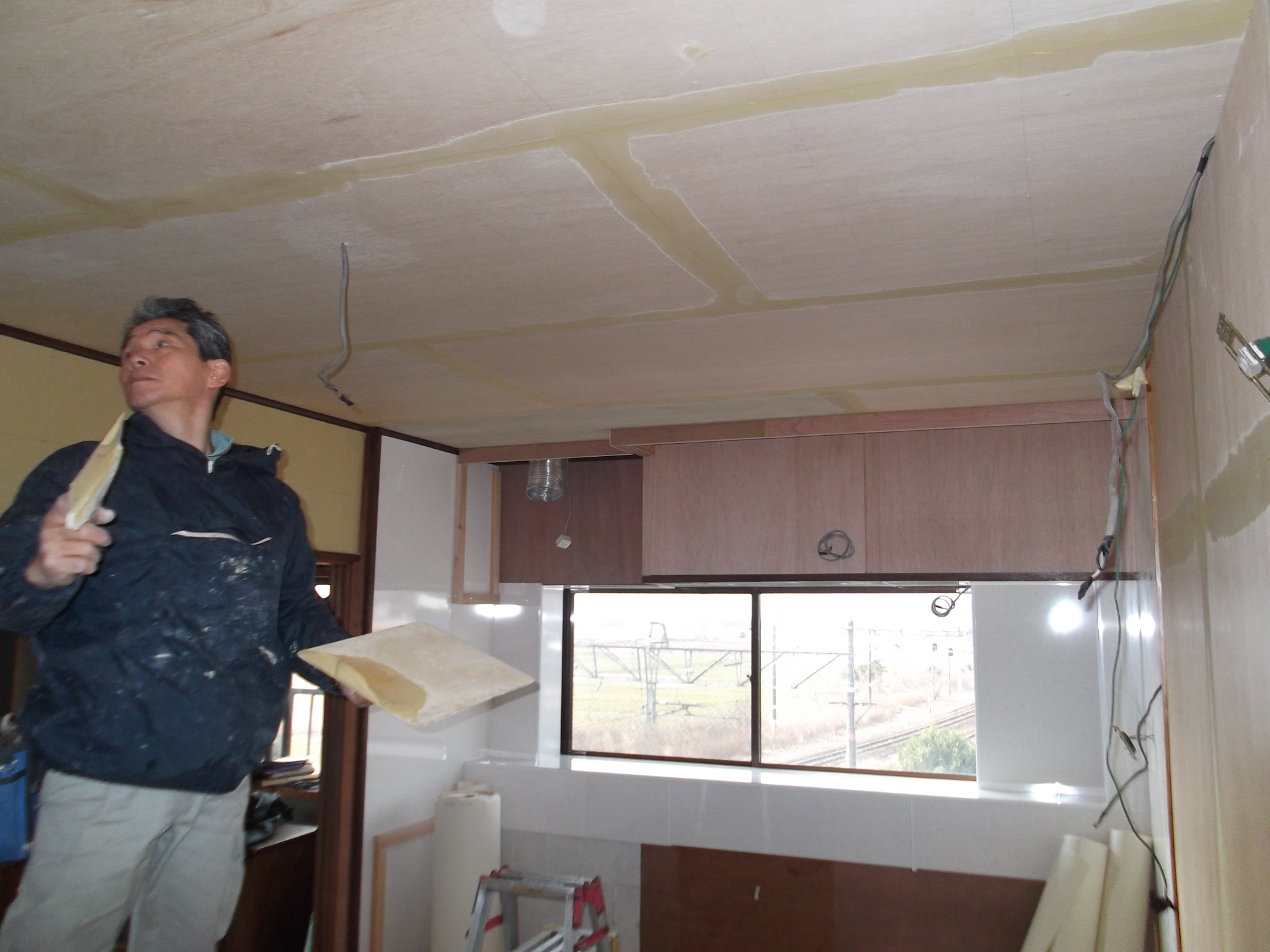 天井と壁廻りにクロスを張り、床にはCFを張って行きます!!