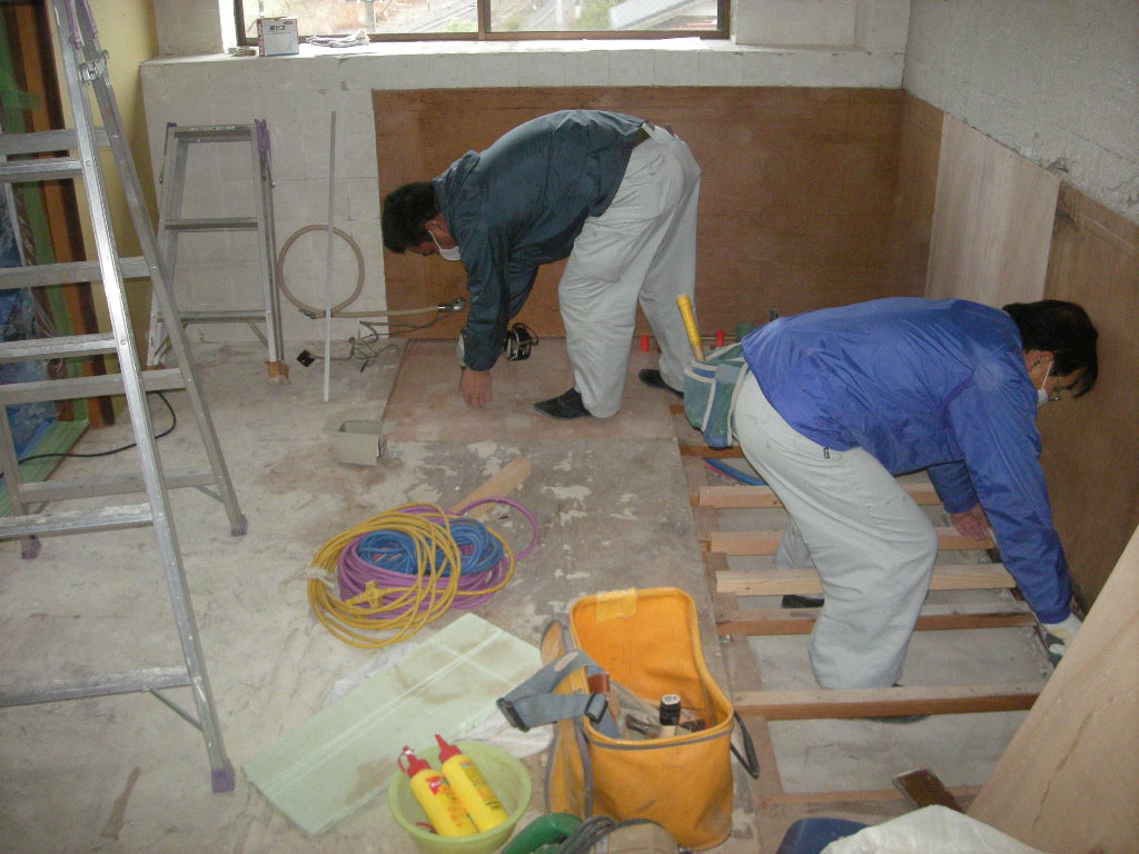 設備屋さんの工事が終わったので、床も補強を入れコンパネを張って行きます!!