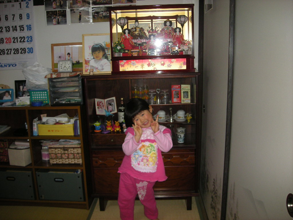 息子のお嫁さんの実家から頂いた、ひな人形の前で記念写真をパチリ!!