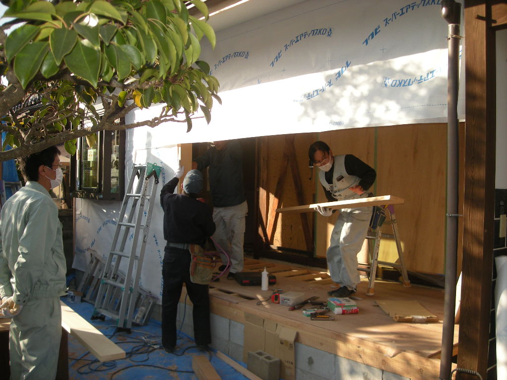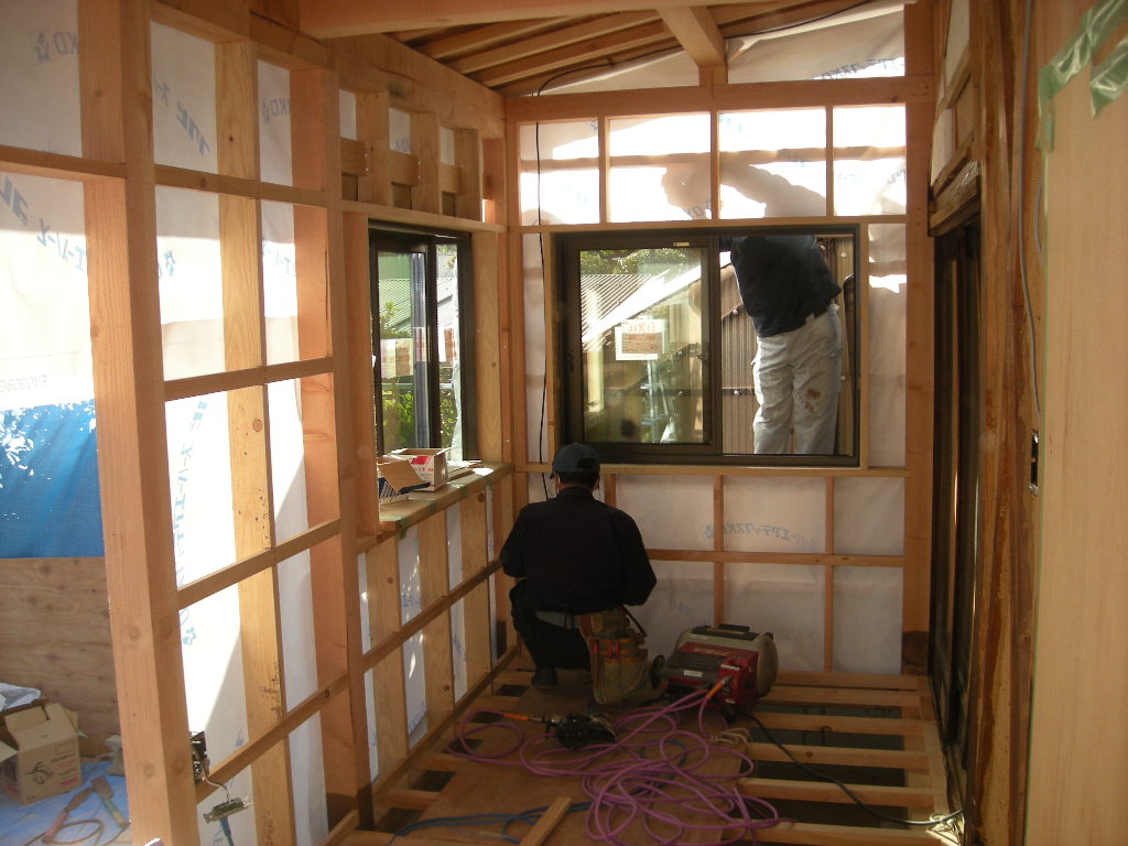 雨戸部分のサッシ枠を取付け、建具(サッシ)を組み込み、この部分の工事の完了です!!