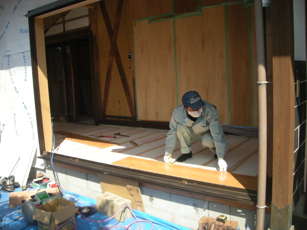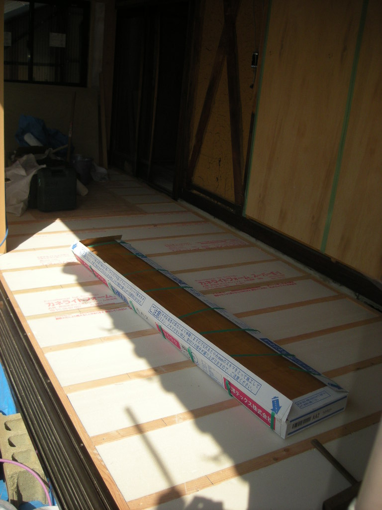 広縁側からフロア材を張って行きます!!