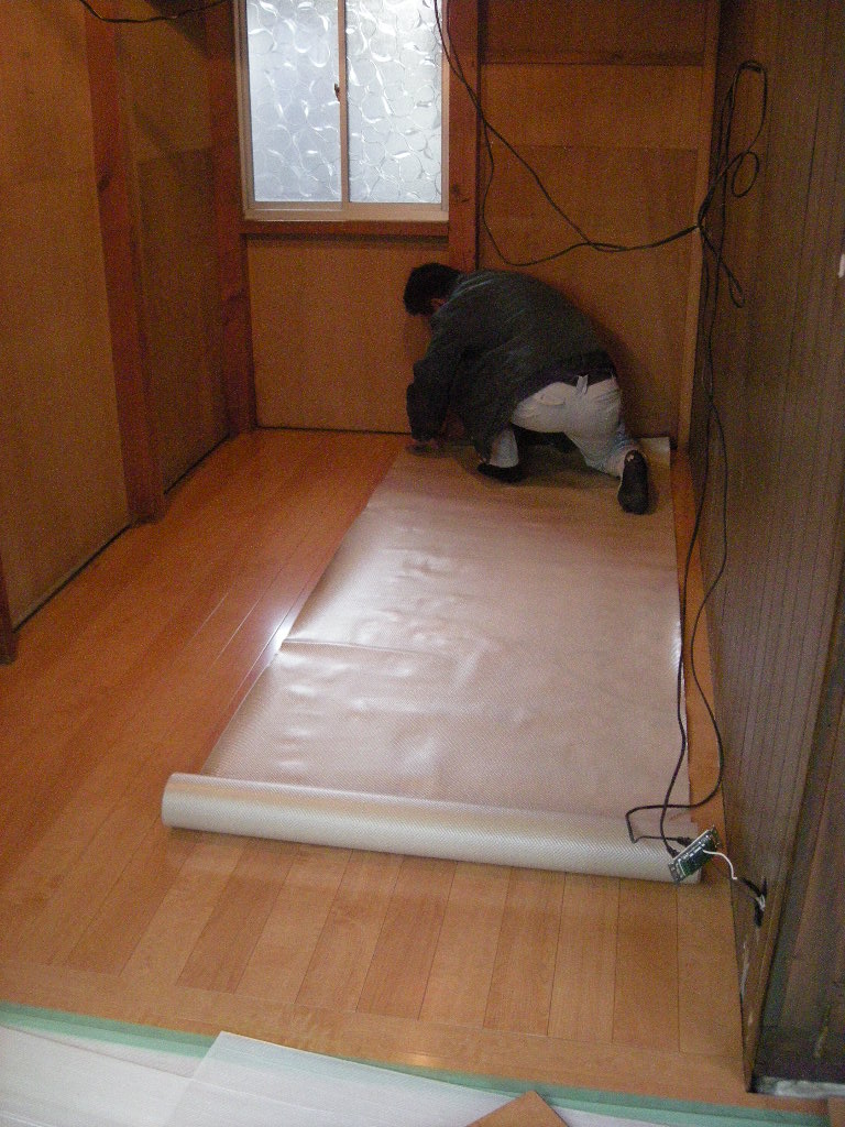 順次フロア材を張って行き、フロア材を傷付けない様にすぐに養生用のシートを
